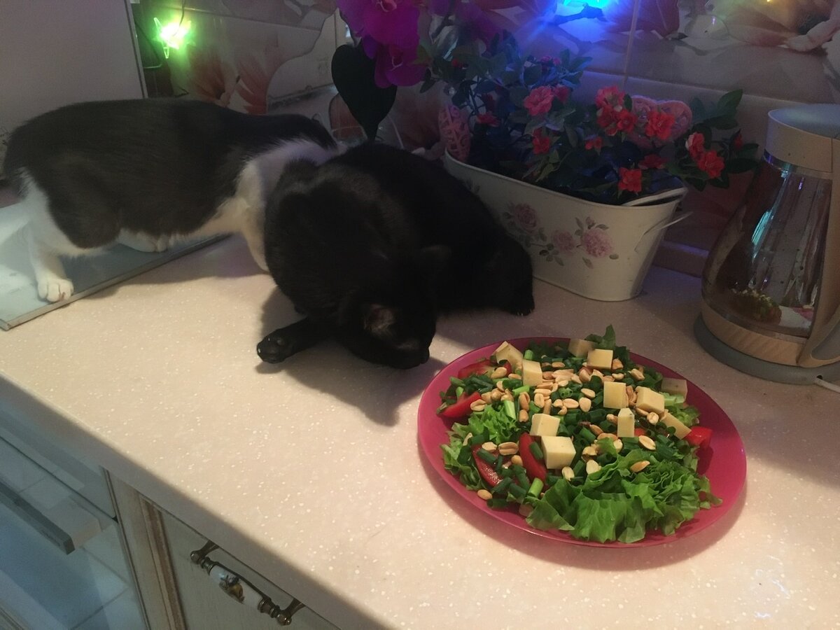 У нас вся "семья" следит за здоровьем и сегодня Риччик "будет делиться" новым вкусом, который мы для себя открыли - фермерский сыр с грецким орехом. Вы же обратили внимание, что без черного любимчика не обходится ни один рецепт. Не смотря на свою особенность, малыш стремиться принимать самое активное участие во всем. Не хотите пропускать новые посты? подпишитесь на телеграм канал Ссылка на канал 🎀🎀🎀🎀🎀🎀🎀🎀🎀🎀🎀🎀🎀🎀🎀🎀 Перед созданием блюда нужно продыроколить салат на свежесть. 😃😃 Вот такой сыр мы вчера для себя увидели. Есть такой еще с душистым перцем и с прованскими травами. Состав вполне, таблицу Менделеева я в нем не нашла. Итак, отбираем у кота салат, моем и рвем на кусочки. Моем и режем помидор и зеленый лук Так как хозяйка у повара с тараканами и мяса не ест - добавляем немного орехов и открываем сыр. Обратите внимание, куда сразу нос потянутся 😃😃 На открытый сыр набежали все, можно сказать, кот контроль сыр прошел 😃😃 . Восковую корочку отодрать от сыра нереа