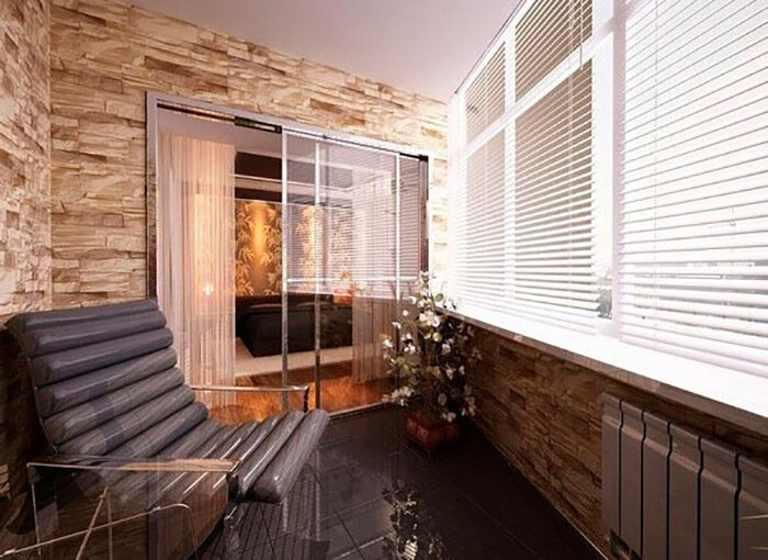 Внутренняя отделка натуральным или искусственным камнем - беспроигрышный вариант для большой лоджии. Фактура такого материала очень декоративна и часто играет ведущую роль в интерьере.