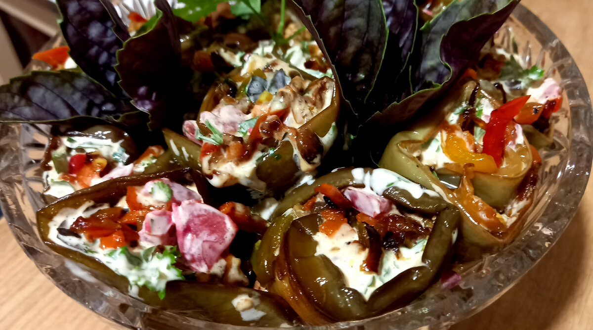 Доброго времени суток! Сегодня хочу приготовить баклажаны, их очень любят в моей семье. Присоединяйтесь к процессу приготовления, это просто и вкусно. Что нужно : Приготовление : Подготовленные баклажаны разрезаю вдоль на 4 части каждый. Солю и обжариваю на сковороде полоски баклажанов до мягкости. Выкладываю на салфетку, чтобы убрать лишнее масло. Нарезаю соломкой морковь, лук шинкую тонкими полосками, перец нарезаю тоже полосками, и всё это обжариваю на сковороде до готовности. Солю и перчу по вкусу. Остужаю. Нарезаю зелень, помидор, измельчаю чеснок и всё смешиваю в миске с майонезом и сметаной. Остывшие баклажаны промазываю полученной смесью и выкладываю слой обжаренных овощей. Сворачиваю аккуратно рулетиком и выкладываю в салатник. Закуска готова к употреблению. Берём вилочку и аккуратно кушаем, очень вкусно и просто. Хороша к мясу и просто как самостоятельное блюдо. При
