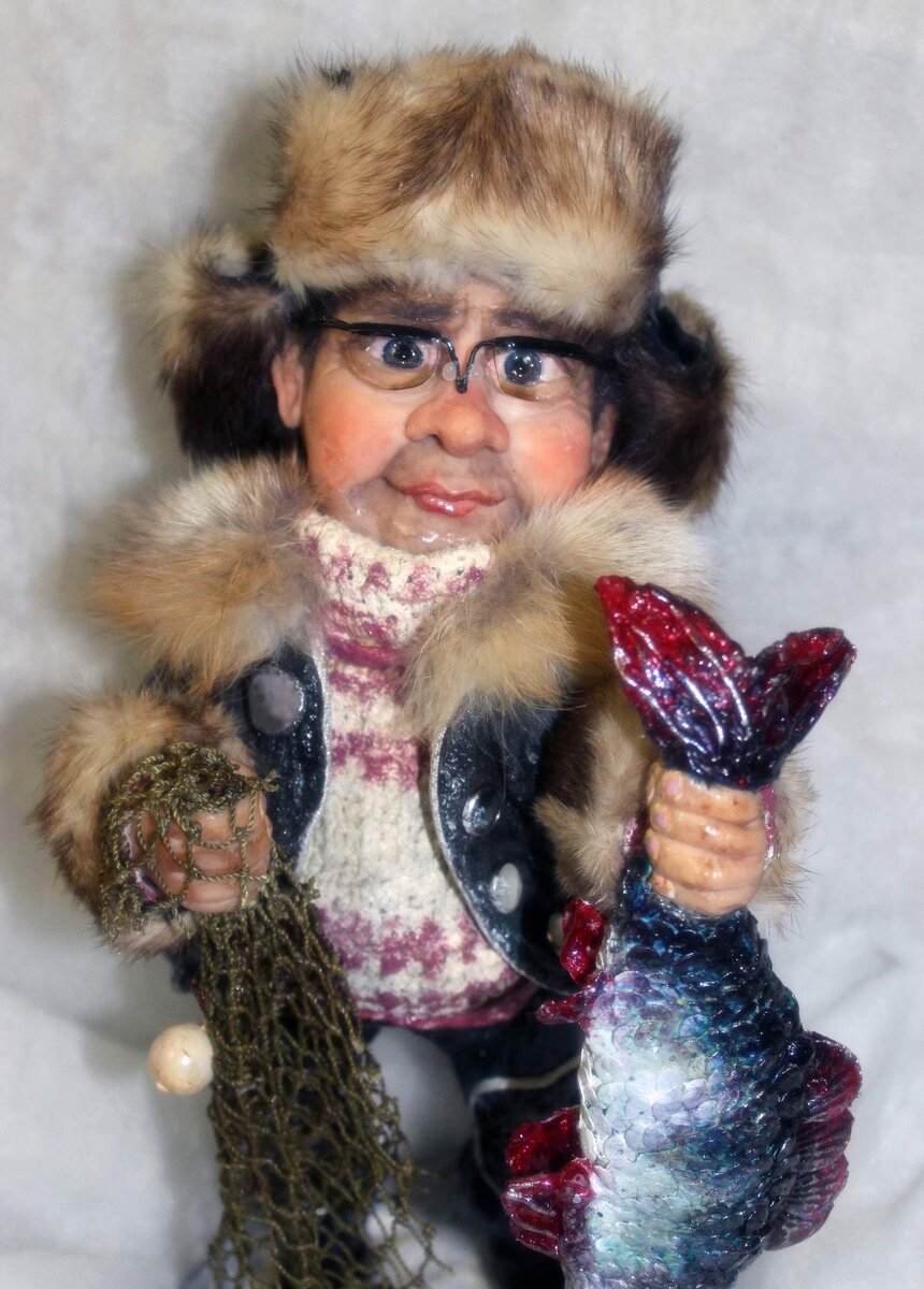 Одним из самых трудных направлений в создании в нашей интерьерной куклы являются работы по фотографии. Очень важно в шарже передать черты лица человека, не упустить ту изюминку, которая для него так характерна. Одни куклы получаются очень быстро, над другими приходиться долго и кропотливо работать. Не маловажно учитывать профессию и увлечение заказчика, то, что ему хотелось бы увидеть, будь он врачом, пожарным, космонавтом, охотником или рыболовом. Создание интерьерной куклы по фотографии занимает от 7 до 14 дней, сроки могут разниться в зависимости от сложности и количества используемых материалов в фигурке. Чуть ниже представлены несколько фотографий кукол охотников и рыболовов. Эти фигурки получились крупными. Мы, как правило, стараемся делать подобные интерьерные работы в высоту 30–40 сантиметров для того, чтобы человек мог их взять, покрутить в руках, ощутить их массу и размер, просмотреть все, даже самые мелкие детали. В основе изделий каркас из вязальной проволоки. Лица и руки я