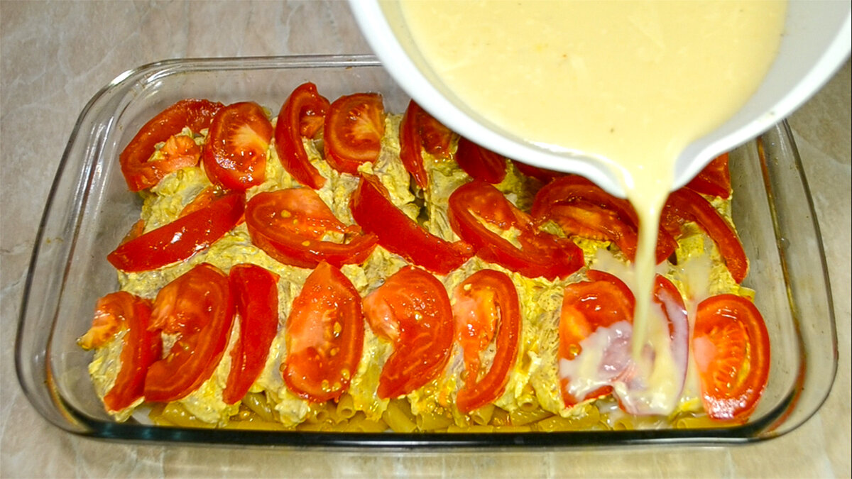 Макароны запеченные в духовке в молочном соусе с курицей, помидорами и сыром