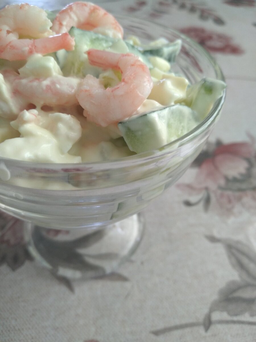 Приветствую вас друзья!У всех бывают такие ситуации когда гости на пороге , нет времени готовить и ты не знаешь чем их угостить.Сегодня поделюсь с вами рецептом салатика. Такой салатик придёт на выручку.Готовится он легко и быстро,а получается вкусным несмотря на свою простоту.Такой салатик можно есть на завтрак и ужин и как лёгкий перекус днём и он не надоедает. Давайте приготовим этот салатик. Список ингредиентов можно посмотреть в конце статьи . Замороженные креветки разморозить в микроволновке,(или заранее в холодильнике)почистить. Яйца отварить вкрутую,остудить нарезать кубиками. Огурец разрезать на четыре части и порезать на четвертинки. В любую миску выложить креветки,яйца,огурцы.Добавить майонез,(если вы на диете и следите за калориями можно заменить на греческий йогурт).Посолить ,слегка поперчить.Всё хорошо перемешать. Переложить салат в порционные салатники и ли креманки,по желанию украсить укропом.(у меня не было в этот ра) Кому понравился рецепт,ловите список ингредиент