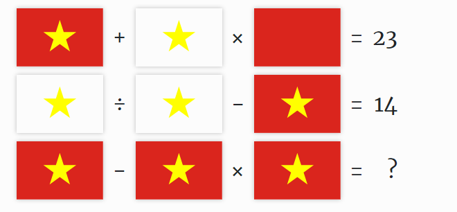 Сегодня предлагаем вам решить задачку с использованием (и очень активным) флага Вьетнама. Условия традиционны, но мы вам их все равно напомним. Дано: 2 неизвестных элемента с уникальными целыми числами от −9 до 9. Задача: вычислить результат последнего уравнения. Солидное количество головоломок можно найти на нашем сайте. Велкам!
