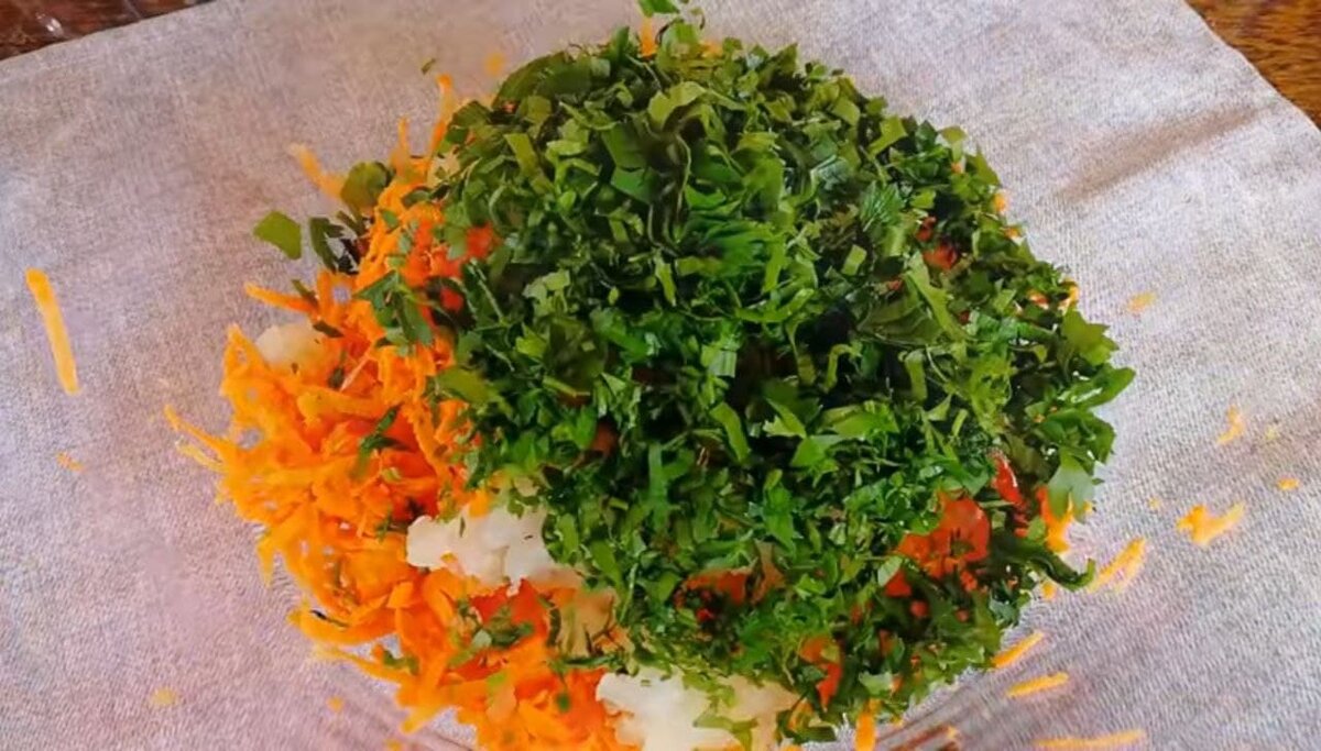 "Он очень ароматный, вкусный и потрясающе сочный" Дорогие друзья всем большой, большой привет. Очень приятно видеть вас на своём канале. Для вас буду готовить чудесный, замечательный обед. Он очень вкусный, сочный с большим количеством овощей, ведь сейчас самое время сбора урожая. Ингредиенты: Ну что начнём. Сперва я беру кабачок и натираю его на крупной тёрке. Делаю это сразу на сито(дуршлаг), чтобы стекала лишняя жидкость. Здесь же подсаливая и перемешивая, затем убираем в сторону ненадолго. Берём миску и начинаем тереть морковь на крупной тёрке. Так же на тёрке натираю лук. Берём пучок петрушки и мелко нарезаем её. После добавляем к моркови с луком. Теперь берём готовые натёртые кабачки и добавляем их в нашу морковно-луковую смесь. Обязательно добавьте к нашим ингредиентам совсем немножечко, как я, горсточку фарша. Он во-первых, придаст превосходный аромат, а во-вторых, сделает мягким и сочным, а также более крепким наш рулет. Теперь благодаря чеснокодавке выдавим наш подготовленны