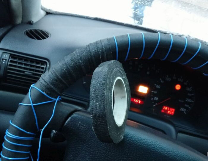 О такой процедуре задумывается наверно каждый автолюбитель, который сталкивался с покупкой машины от небрежного владельца который умудрился испортить весь автомобиль и салон в частности. Многие задаются вопросом, что можно сделать с рулевым колесом, которое пришло в негодность. Первый вариант для самых экономных водителей это обмотать по периметру черной изолентой в несколько слоёв. Наверняка кто нибудь видел, что на газелях именно так и выглядит рули гезелистов. Кстати в советское время было популярно обматывать разноцветными проводами, тем самым увеличивать толщину. И еще я видел на некоторых копейках обтянутый кожей с металлическими заклёпками, получается съемный вариант для стирки и сохранения внешнего вида. Второй вариант более логичный чем первый, но будет стоить около пятисот рублей может и меньше в зависимости от региона. Конечно же, это прибрести Чехол на руль подходящего диаметра. Выбрав нужный цвет и материал. Благо в торговых центрах выбора очень много. Третий вариант боле