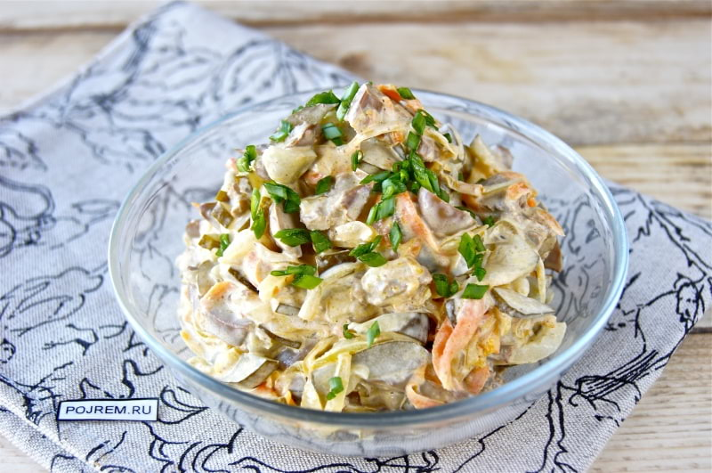 Здравствуйте, дорогие подписчики! Есть рецепты, которые переходят из рук в руки, стоит лишь кому-то приготовить их на праздничный стол. Этот салат пришёл в нашу семью именно так и сразу завоевал любовь и мужа, и детей. Теперь я готовлю его постоянно и уже мои гости всегда просят рецепт. Ингредиенты: Приготовление: Субпродукты хорошо разморозьте и промойте. Печень залейте молоком и оставьте на 30-40 минут, это уберёт возможную горечь. Куриные желудки очистите от плёнки, если таковая имеется. На небольшом количестве масла обжарьте печень до готовности, выложите на бумажное полотенце и дайте остыть. Желудки отварите в подсоленной воде в течение часа. Готовые ингредиенты порежьте либо мелким кубиком, либо тонкой соломкой. При желании желудки можно заменить куриными сердечками, они тоже отлично впишутся в салат. Лук нарежьте тонкими полукольцами и замаринуйте примерно на 30 минут. Для маринада смешайте стакан воды, уксус, соль, сахар и растительное масло. После этой процедуры лук отдаст гор