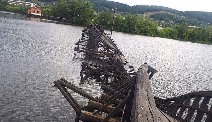 «В селе Махнево (Свердловская область) произошло частичное обрушение части 15-метрового автомобильного моста. При этом конструкция была отремонтирована в августе.
