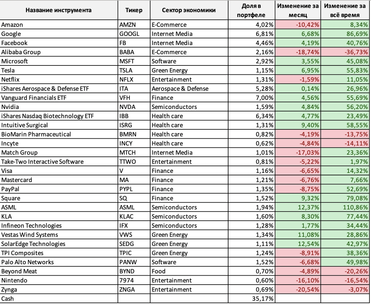 Список аутсайдеров за весь период возглавляет Alibaba с -36,73%. Вероятно, крепкие инвесторы смогут заработать на этой идее в д/с перспективе. Всего же только 6 позиций из 30 в минусе, то есть 20% всех позиций. Среди них Alibaba, Beyond Meat, Nintendo, Incyte, BioMarin Pharmaceuticals и Zynga.