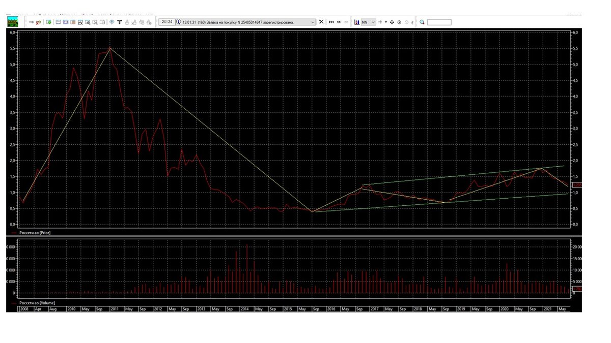 Если по смотреть на технический анализ на месячном графике на акции Россети начиная с 2018 года. Акции Россети находятся в широком растущем коридоре 1,20-2,0, в настоящие акции Россети практически сейчас находятся на линии поддержки. По осцилляторам видно на месячном графике акции Россети вошли в зону покупки и уперлась в линию поддержки. При таком раскладе акции Россети стали интересны инвесторам, чтобы приступить увеличивать свой инвестиционный портфель. По техническому анализу сейчас просматривается три сценария в акциях Россети, один из которых окажется более реалистичным чем остальные.