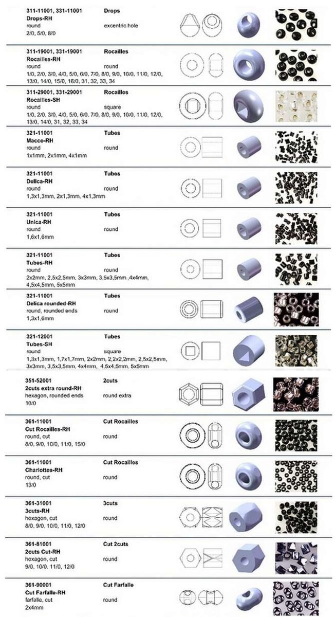 - 311 19 001 – бисер рокайль с круглым отверстием (оно обозначается как "r.h");