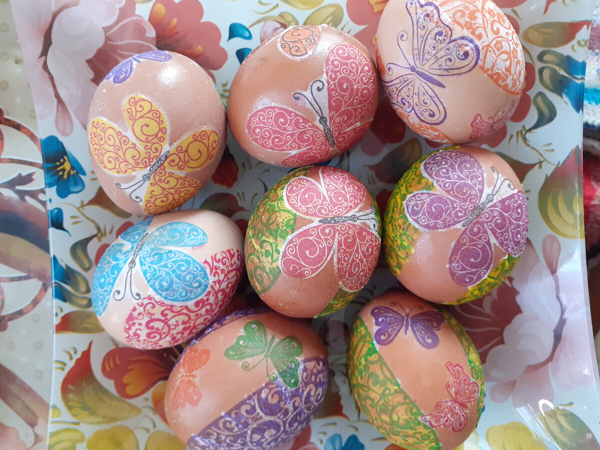 Этот способ придуман не мной, но я его хорошо освоила и могу рекомендовать другим. Многие мои подружки тоже уже делают именно так. Для начала необходимо подготовиться – сходить на рынок и купить бумажные салфетки с такими рисунками, чтобы было удобно их вырезать и расположить на яйце. То есть рисунок должен быть четким, замкнутым и небольшим по размеру. Для покраски обычно выбираются белые яйца, на них более четко виден рисунок и меньше видно его границы. Да и просто так красивее получается. Но можно взять и желтые, поскольку белые быстрее разбирают. Элементы рисунков вырезаются, я для этого использую маникюрные ножницы. После этого кусочки салфеток с рисунком расслаиваются, остается только тоненький слой с рисунком, который нам и понадобится. Яйца необходимо сварить вкрутую обычным способом, а затем остудить. После этого можно приступать к «покраске». Берется обычная тоненькая кисточка для красок (можно взять кусочек губки), обмакивается в обычный сырой яичный белок (желток предварите