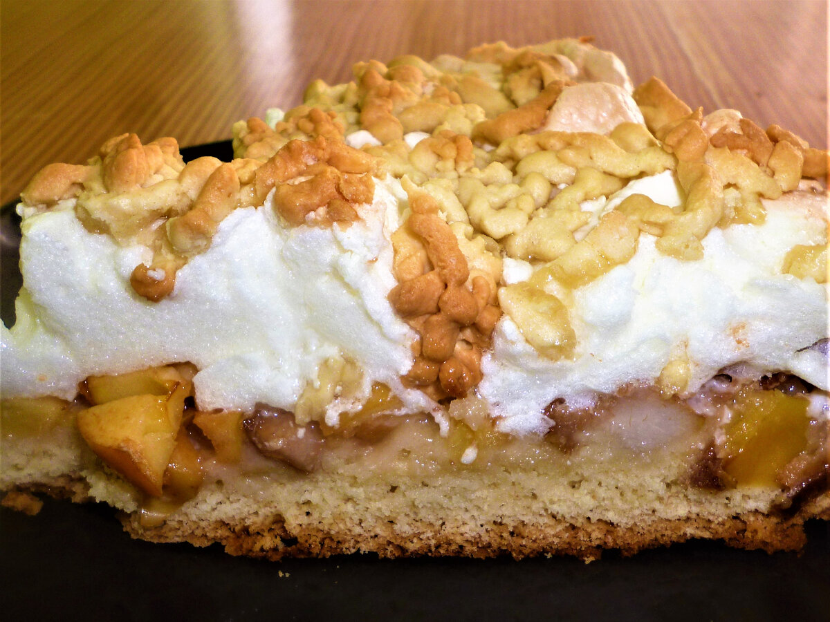 Этот пирог можно печь и с яблоками, и с грушами. Думаю, плотные сливы тоже будут уместны, да и некоторые ягоды тоже. С грушами вкус получается нежнее. С яблоками же, благодаря некоторой кислинке, вкус ярче, насыщеннее. Я в этот раз готовила из смеси яблок и груш, вышла "золотая серединка". В пироге прекрасно все: и нижний рассыпчатый песочный корж, и ароматная начинка, которая великолепно пропекается. Даже шкурку с фруктов снимать не обязательно, она совсем не мешает. Но больше всего мне нравится восхитительное "суфле". Я даже придумала в следующий раз персонально для себя запечь фрукты просто под суфле без всякого теста. Домашним же очень нравится тесто в основе пирога. Выходит оно рассыпчатым и нежным. Да и не удивительно - в нем используются только желтки яиц. Еще такие рецепты мне нравятся тем, что нет остатков. Желтки идут в тесто, белки - в суфле. Не слишком люблю, когда в составе используется либо только белок, либо желток. Нужно срочно придумывать, а что делать с оставшимся про