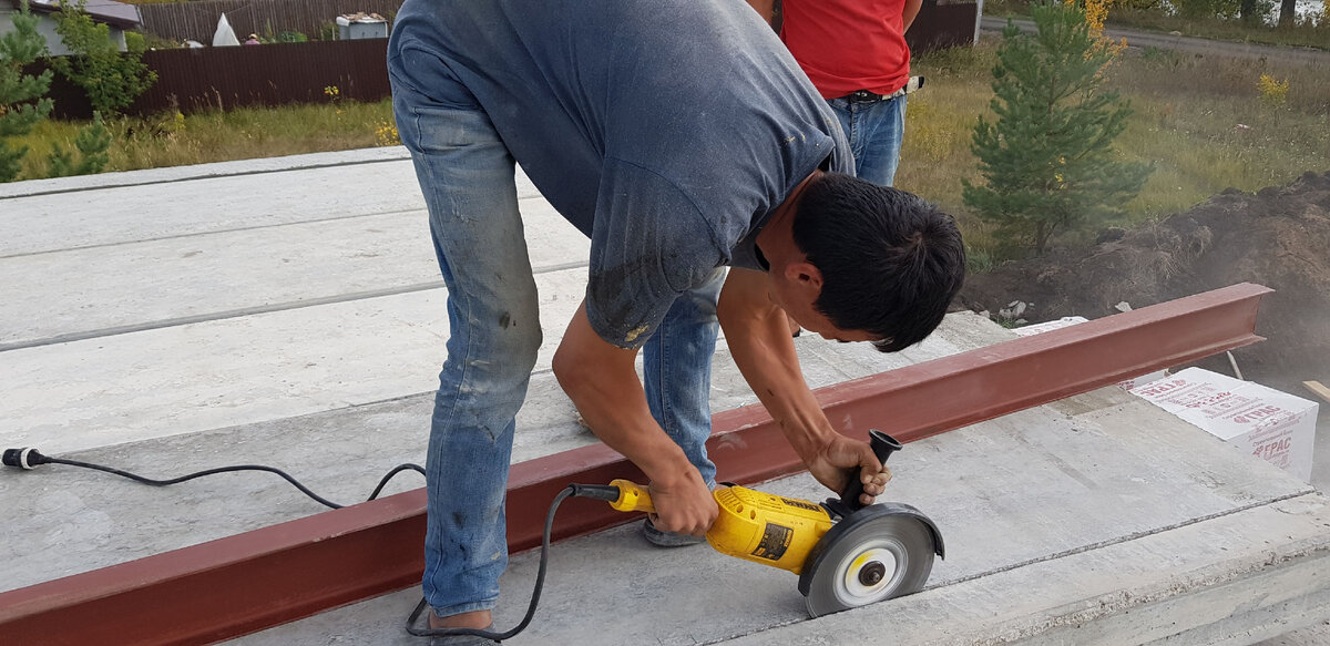 Казалось бы, привычный элемент дома – балкон. Но как его «приделать» к дому, вот вопрос. И это при условии того, что этим занималась строительная организация имеющая отдел проектирования. Сначала были предложены столбы подпирающие балкон. Но в этом случае терялась легкость балкона и нарушался стиль определяемый выдвинутой крышей и балконом. Под балконом будет располагаться веранда, которую хотелось видеть максимально открытой. Затем нам предложили сделать оттяжки от углов балкона к армопоясу. Но это тоже нарушало замысел стиля. После долгого поиска решений проектировщик предложил между плитами расположить двутавровые балки, а выступающие консоли которых должны стать основой балкона. Видимо это был шаг отчаяния. При толщине плиты 22 см, двутавровый швеллер должен быть 240 мм! Это конечно супернадежная конструкция, но тогда толщина балкона будет не менее 50 см. В результате было найдено следующее решение. До укладки пустотных плит, их перевернули нижней стороной вверх и сделали пропилы н