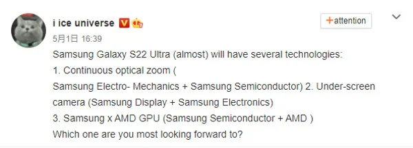 Народ привет, и мы возвращаемся с крутыми новостями, которые касаются линейки Galaxy S22. Мы поговорим о следующей большой инновации в отделе камер, которая была официально представлена, и вероятно, уже появится на смартфонах в следующем году. Речь идет о камере с переменным зумом. Правда пока что Samsung тут не причем, но мы помним утечку от инсайдера с великолепной репутацией Ice Universe о том, что Galaxy S22 Ultra адаптирует эту новую технологию. Чуть ранее на прошлой неделе мы говорили о большой утечке со спецификациями всей линейки Galaxy S22, которая раскрыла емкость аккумулятора, варианты хранения и все такое. И тогда у нас не было оснований предполагать, что S22 Ultra будет иметь на борту этот переменный зум. Однако, после того, что только что случилось, эти основания могут появиться. А всё потому что конкурирующий бренд Oppo уже продемонстрировал технологию непрерывного зум на своем мероприятии, состоявшемся несколько дней назад. А если эта технология готова у Oppo, то мы мо