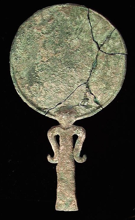 Самые ранние образцы египетских медных зеркал датируются 2900 годом до нашей эры. Формы многих из них указывали на то, что у них, вероятно, были ручки, сделанные из дерева или слоновой кости. ХРОНОЛОГИЯ ДРЕВНЕГО ЕГИПТА Например, вот зеркало, которое описывается как "самое старое" из известных нам. Оно выглядит довольно сложным технически: отражающая поверхность и ручка вылиты монолитно: Взглянем на одну жанровую сцену из искусства Древнего Египта. Эта сцена обычно описывается как "Будуар царицы Кавит". Изображена сама царица, сидящая на стуле, со служанкой, поправляющей ей парик, в то время как слуга наливает ей напиток; царица уже пьет из чаши. В левой руке она держит зеркальце, как бы проверяя, насколько хорошо будет сидеть ее парик в конце всех манипуляций с ним: Рельеф изображён на саркофаге. Царица Кавит была одной из жен фараона Ментухотепа II, первого фараона Среднего Царства. Кавит являлась всего лишь одной из цариц низшего ранга, и ее саркофаг сравнительно невелик по ра