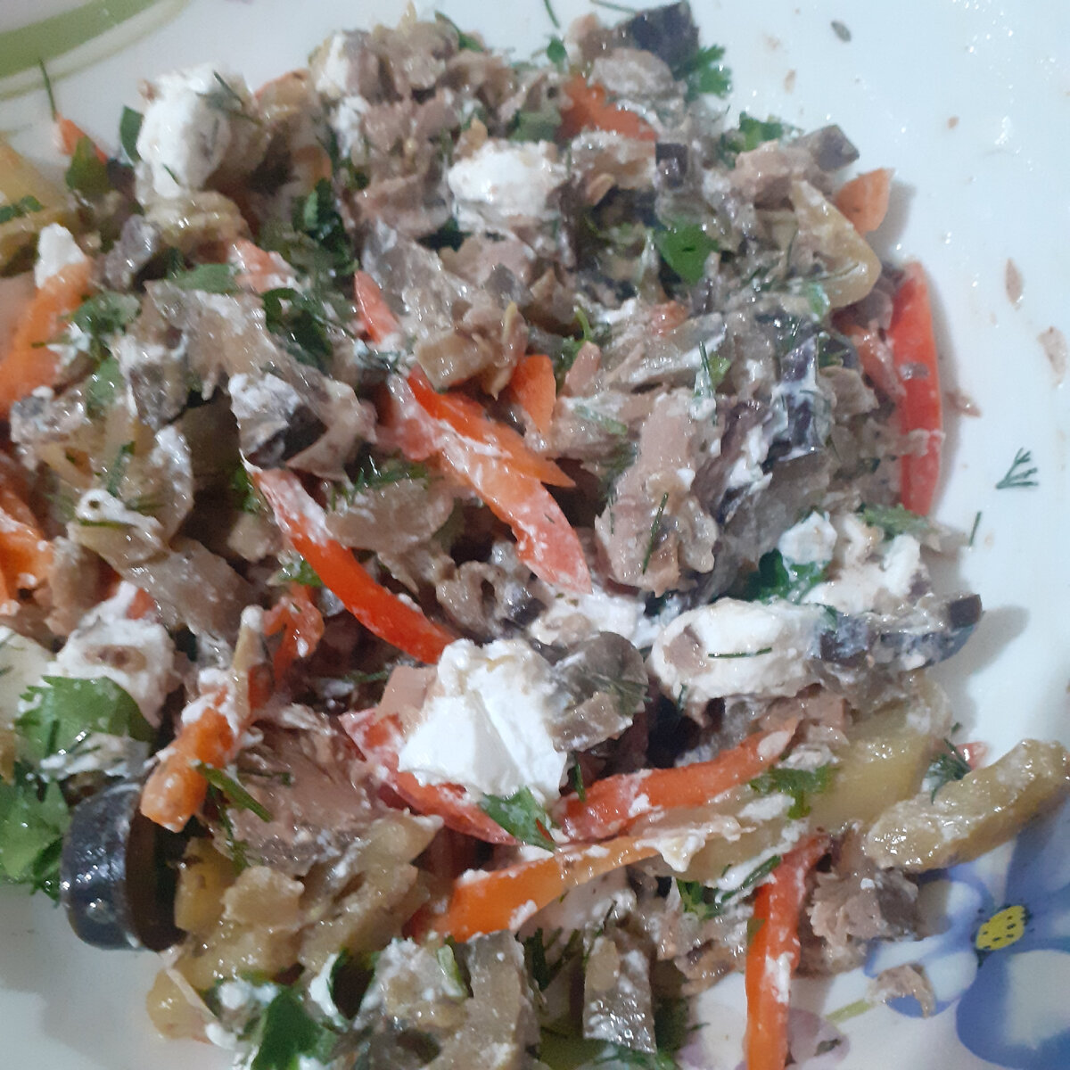 Всем привет! Готовила этот салат и не знала понравиться мне его вкус или нет, т.к. не могла представить , как эти продукты "поведут себя в одной компании" . Зря переживала, салат получился очень вкусный! Способ приготовления: Баклажан моем, нарезаем соломкой. Перекладываем в чашу, добавляем сухой чеснок, сухой базилик, растительное масло и соль. Хорошо все перемешиваем. Выкладываем на сковороду , обжариваем на слабом нагреве 5 минут, помешивая в процессе. Затем в сковороду добавляем сметану Хорошо перемешиваем , продолжаем обжаривать 2 минуты. Добавляем к баклажанам воду, делаем средний нагрев. Тушим баклажаны до полного выпаривания воды. Готовые баклажаны выкладываем в салатник. Консервированный тунец , разделываем на кусочки с помощью вилки. У меня был в собственном соку , филе куском . Жидкость нужно слить. Можно для этого салата использовать консервированную горбушу в собственном соку. Рыба должна быть нежирная. Тунец добавляем к баклажанам. Нарезаем укроп и петрушку, добавляем в