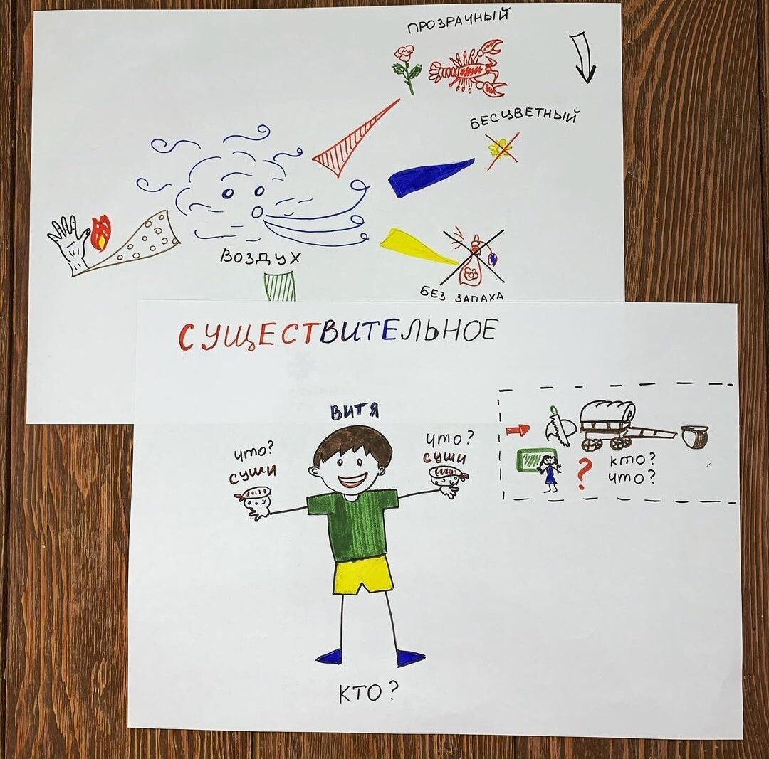 Вы знаете, что я всегда ищу максимально простые и эффективные пути обучения. Сейчас в моем арсенале интеллект-карты, как альтернатива конспектам, и мнемотехники, как альтернатива зубрежке. На фото - наши мнемокарты. Важно: это простые примеры и не всегда надо составлять такие карты. Но в средних и старших классах это точно пригодится. Карточка "Существительное". Мы разбиваем само слово "существительное" на две части "суще" и "вите", к которым можем подобрать образы: Суши и Витя. Образы подбираем, чтобы были понятны ребёнку и знакомы. Итак, у Вити суши. Витя - кто? Суши - что? Рядом рисуем схему - определение. После стрелки у нас идёт пила, которая распиливает на части окошко цитаты в комиксах. Другими словами - существительное - это часть речи, дальше рисуем "обоз", обозначающая, далее предмет (в нашем случае горшок), девочка отвечает у доски - отвечает на вопросы "Кто ?" и "Что?". Такие карточки можно сделать на все части речи и потом связать их в виде общего мультика и