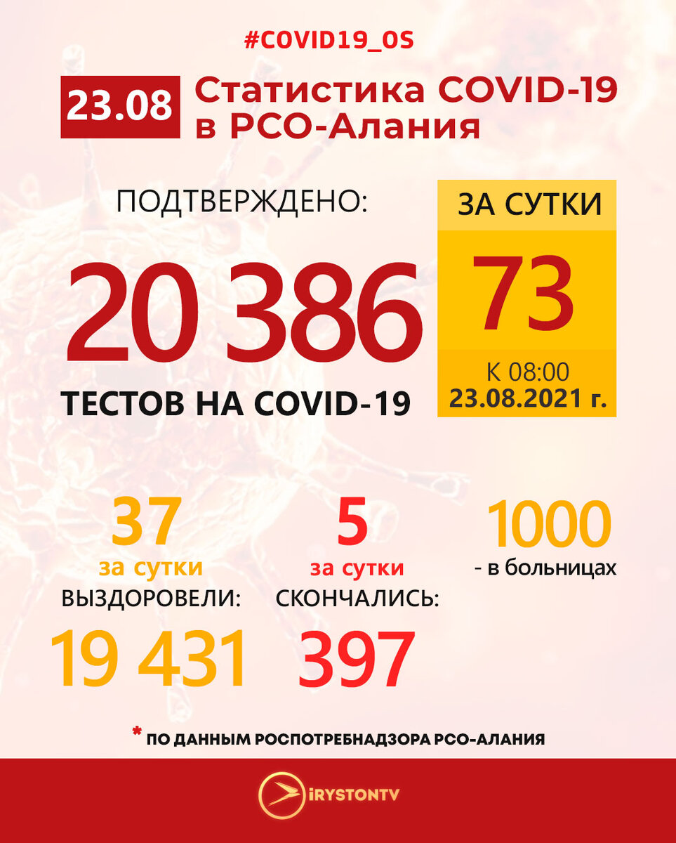 По данным Роспотребнадзора РСО-Алания на 08:00 23 августа 2021 года в Республике Северная Осетия-Алания зарегистрировано 20 386 (+73 за сутки) случаев заражения новой коронавирусной инфекцией.
