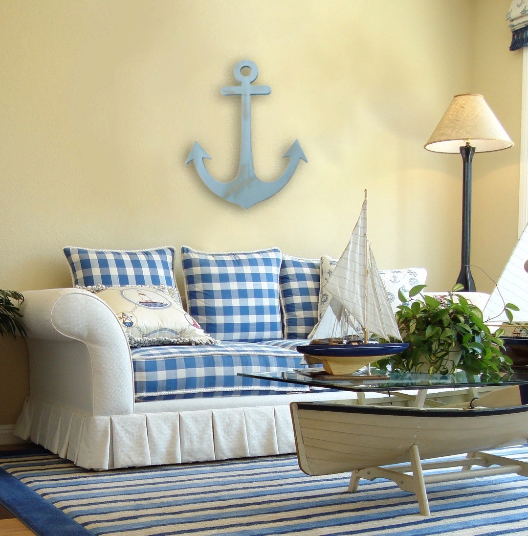 Морской стиль в интерьере навевает приятные воспоминания о лете, позволяет мечтать о путешествиях и приключениях. Кроме того, он оригинальный и уютный, что так важно для дизайна спальни, в которой человек отдыхает в конце дня. Спальня в морском стиле – это очень интересный вариант. Особенности Отделка В морском дизайне широко используются натуральные материалы: дерево, камень, галька (вне зависимости от выбранной концепции). Пол может стать как палубой, так и песочным пляжем или морским дном. В первом случае достаточно использовать паркет, а во втором – ламинат, ковролин. Если интерьер более пляжный, то будет уместен ворсистый ковёр песочного цвета (или плетёный, напоминающий о бунгало на острове). Если ваш интерьер – это минимализм, стены можно покрасить или обработать штукатуркой. Вагонка, ламинат и паркетные доски хорошо передают морскую тематику. Можно выбрать как натуральные оттенки дерева, так и классические цвета стиля – голубой, белый. Обои актуальны не только однотонные, но и