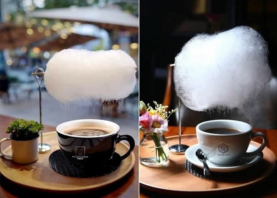 Этот кофe подaется с облaком слaдкой ваты. Пар от чашки поднимается и облако начинает поливать кофе сахаром.