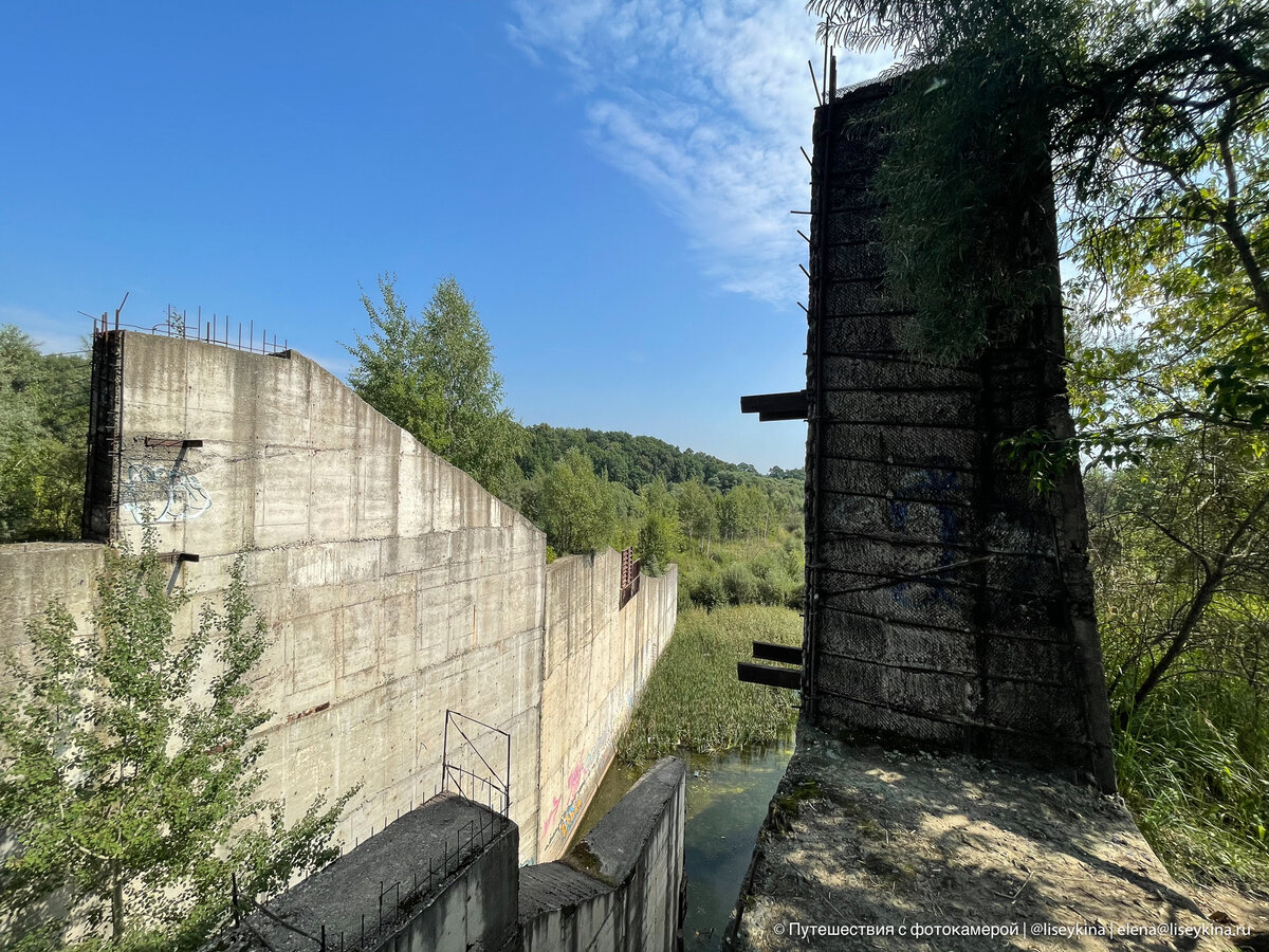Проект "Подольское море" должен был стать одним из самых масштабных и крупных в Подмосковье. Планировалось, что в месте слияния рек Пахра и Моча, рядом с Дубровицами, появится огромное водохранилище площадью 1000 гектаров. Но, по некоторым данным, стройка, начатая в 1980 году, так или иначе была обречена. Но сначала всё шло по плану и мероприятие казалось очень масштабным: чтобы построить "море", которое должно было питать водой весь юг Подмосковья, съезжались строители со всей страны. Рядом возник строительный городок, который даже можно найти на старых картах. Жителям деревень, попадающих в зону подтопления, выдали квартиры в Подольске, Дубровицах и Щапово. И было приказано освобождать дома. Только не все послушались, некоторые решили остаться "до последнего"... И эти люди до сих пор тут живут. По плану тут должен был быть каскад из трёх гидроузлов. Но успели построить только один водосброс. Правда, и он впечатляет. Бетонная конструкция высотой с пятиэтажный дом и со стенками тол