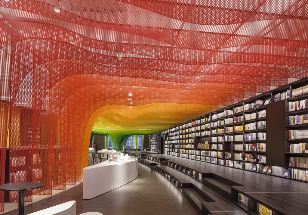 Бурно развивающийся Китай представляет настоящий рай для архитекторов и дизайнеров: публика рада каждой новинке, а возрастающая застройка дает простор для творчества и новых идей. Так дизайнеры компании WUtopia Lab предложили украсить книжный магазин в провинции Сучжоу довольно необычным образом. Покупатели привыкли видеть магазины книг спокойным местом, где стоят строгие стеллажи, полные литературных произведений, а в читательском зале ничто не отвлекает от главного занятия. Но в этом книжном магазине есть чему удивляться: его потолок украшает каскад сетчатых алюминиевых пластин всех цветов радуги. Радужный градиент тянется через все заведение, придавая каждой секции магазина свое особое настроение. Необычную композицию дизайнеры назвали «Занаду радуг». «Что-что радуг?» — спросите вы? Занаду или Шанду — это название исторического и важного для китайцев места. Так назывался город, который заложил внук Хингис-хана Хубилай, дав начало новой китайской империи Юань. Путешественники