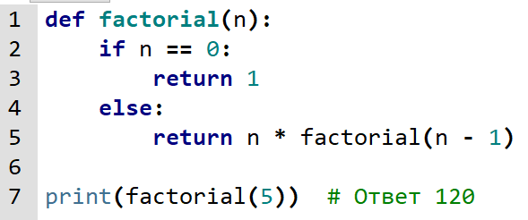 Рекурсия - одна из самых сложных для понимания тем. Но, разобравшись в этой теме, можно открыть для себя массу возможностей. Тот, кто понимает рекурсию - владеет очень мощным инструментом. Рекурсия — прием, когда функция может вызывать сама себя. Для изучения рекурсии обычно используют задачу вычисления факториала числа N. Это 1*2*3*...*N. Так как в такой последовательности число N умножается на произведение всех чисел меньше N, факториал легко можно записать в рекурсивном виде: Факториал(N) = N * Факториал(N-1) Строка 3 - это точка выхода из рекурсии. Если число будет равно нулю, произойдёт выход, то есть функция вернет единицу. В противном случае будет выполняться 5 строка. Функция будет уходить "вглубь", как показано на схеме: А уже "из глубины" обратно к "вершине", то есть числу 5, будет возвращаться результат (1 * 1 * 2 * 3 * 4 * 5). Дано положительное число a и целое неотрицательное число n. Вычислите a^n не используя циклы, возведение в степень через ** и функцию math.pow(), а