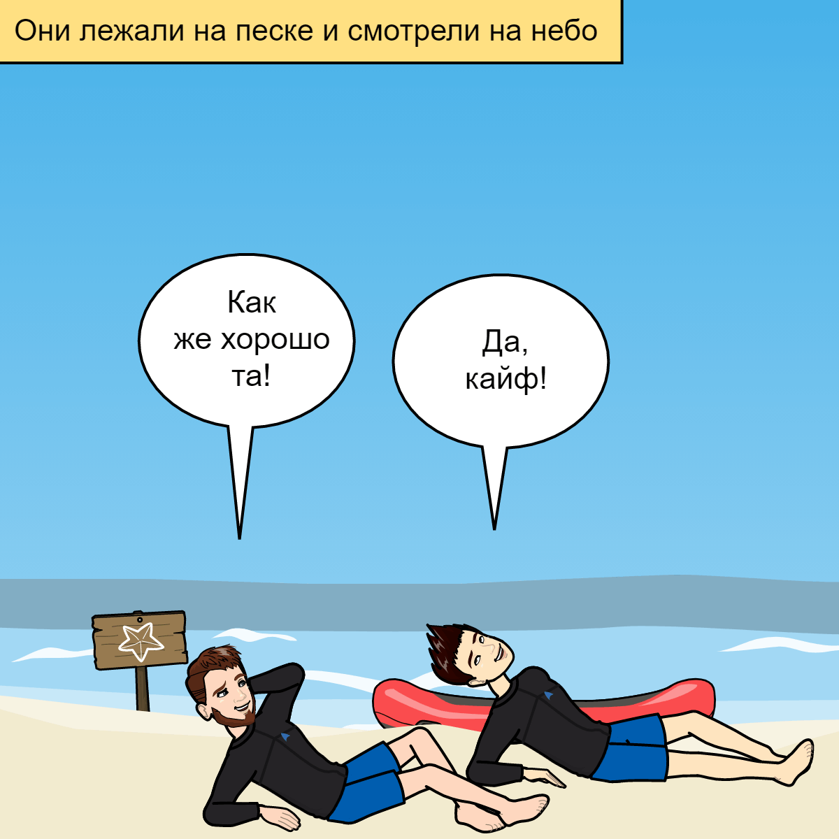 Содержание рассказа. Макс и Володя вместе вышли из океана и сразу же упали на песок. После занятия они не поехали в лагерь как все. Они пообедали в кафе на берегу и решили дальше кататься на сёрфе, так как волны сегодня были особенно большие, и можно было чему-то научиться новому. Они знали одно прекрасное место, где были много лет назад и очень хотели снова там побывать именно сегодня. Волны там формировались за счёт рельефа дня, и всегда были достаточно высокие, а сегодня они были просто огромные, и друзья забегали в океан с криками восторга. Сегодня они покатались сполна. Володя вспомнил многие трюки, которые выполнял раньше, но, конечно, до того прошлого уровня ему было ещё далеко. Ну ничего, он вспомнит, и будет кататься даже лучше. Они лежали на песке и смотрели на небо. -Как же хорошо та! – Макс -Да, кайф! – Володя. На небе было много облаков. Такое бывает редко, обычно небо тут безоблачное. -Но надо уходить, скоро явно будет дождь, а ты знаешь какие тут бывают ливни – Макс -Ну