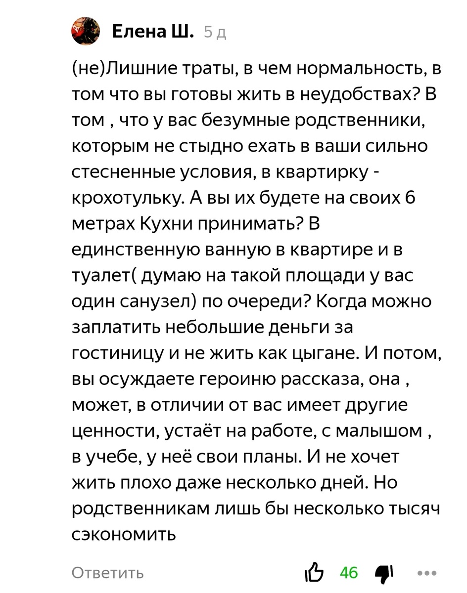 На одном канале, позиционирующий себя как финансовый, была затронута тема приёма гостей в маленькой квартире. Вкратце: двоюродная сестра собралась с мужем в Москву погулять дня на 4 и напрашивалась в гости к своей Московской родственнице с полуторагодовалым ребенком и мужем пожить в их однушку. Московская родственница категорично ответила отказом и двоюродной сестре пришлось идти в гостиницу, за что она и предъявила в трате лишних 8000 рублей своей родственнице. У Московской родственницы взыграла совесть и она спрашивает: как же ей надо было поступить? На вчерашний день комментариев накопилось более двухсот. И все они полностью поддерживают Московскую родственницу, ведь к ней наглым образом напрашивались, а у неё и так стесненные условия, да еще и ребенок. Я высказалась против всяких отелей, когда касается дело родственников и что лучше в тесноте, да не в обиде. Рассказала, что всегда принимаем в своей 37- ми квадратной квартире приезжающих по делам или конкретно к нам в гости. А са