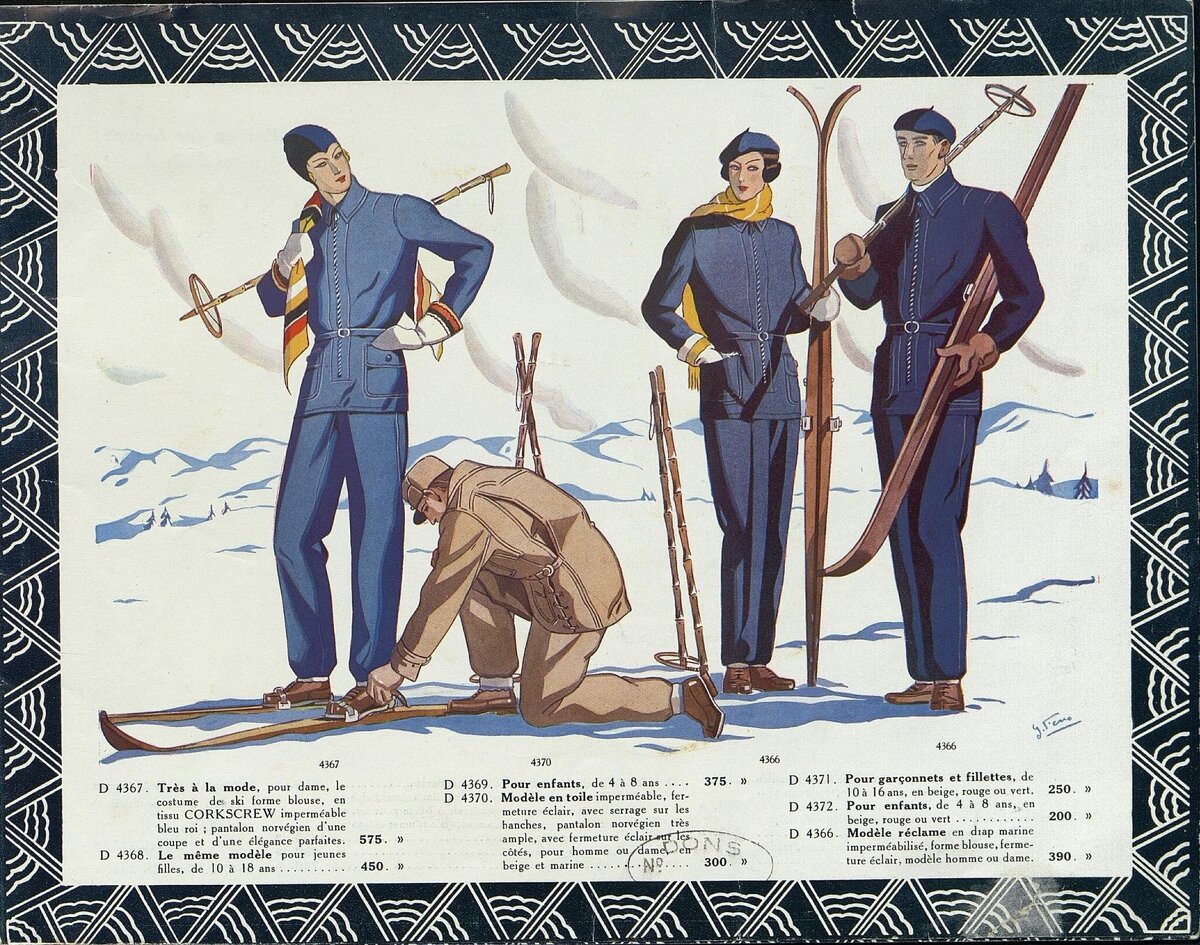 Как известно французы являются законодателями моды. Если посмотреть на их одежду, на их образ, то безошибочно можно уидеть определенный шарм, стиль и что-то изысканое, что однозначно будет говорить о том, что эта модель создана во Франции, или французом, или имеет какое-то отношение к Франции. Конечно, современный французский стиль уже не так изыскан, и смешался с другими стилями, но ещё пару десятков лет назад, Франция могла похвастаться своими модными тенденциями. Французский стиль не только в праздничной одежде, но и в спортивной одежде. Каталог 1935 г. может нам это продемонстрировать. Элегантные лыжные спортивные костюмы для женщин и для мужчин. Пуловеры или Pull Over, переводится как Надевать сверху. Всё достаточно красочно, но сдержано. Кашемировые пуловеры. Обувь для катания, коньки, зимняя обувь. Спортивное снаряжение для туристов, обмундирование для хокеистов.