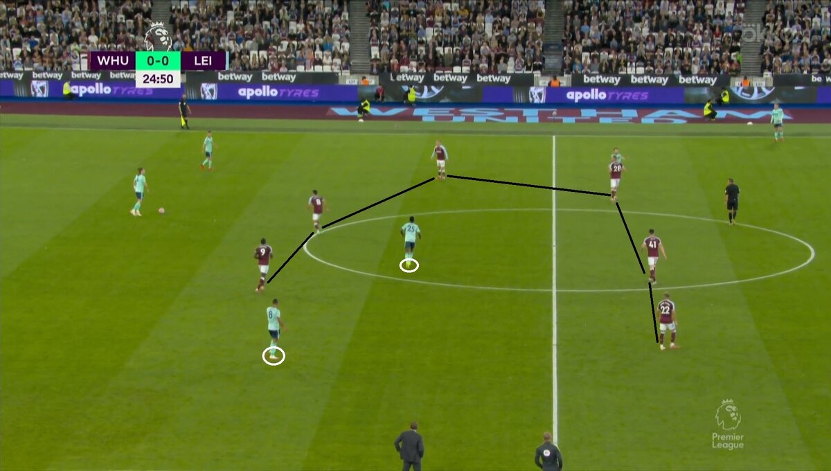 После хорошей победы над «Волками» команда Брендана Роджерса с треском провалилась в Лондоне. «Лестер» вчерашнюю игру проиграл уже в первом тайме – удаление и пропущенный гол. У команды знакомые проблемы. Например, слабая позиционная атака. Вчера «Вест Хэм» оборонялся по схеме 4-4-2 и закрывали Юри Тилеманса и Вильфреда Ндиди в некий блок (на скриншоте наглядно видно). Уже впервые 10 минут Роджерс вносил коррективы в игру. Люка Томас смещался к Даниэлю Амарти и Чаглару Сёюнджу. Так гости перестраивались на модель с 3 центральными защитниками, и провоцировал на смену оборонительной структуры «Вест Хэма, так как уже двоих игроков в первой линии обороны не хватало. Если выход из обороны наладить удалось такими перестроениями, то в следующих стадиях атаки были проблемы. В первом тайме при владении 59% игрового времени только 21% действий прошли на тети поля хозяев. Соотношение ударов 9-2 в пользу «молотков». Во втором тайме «Лестер» полностью отдал инициативу «Вест Хэму» - 63% владение у