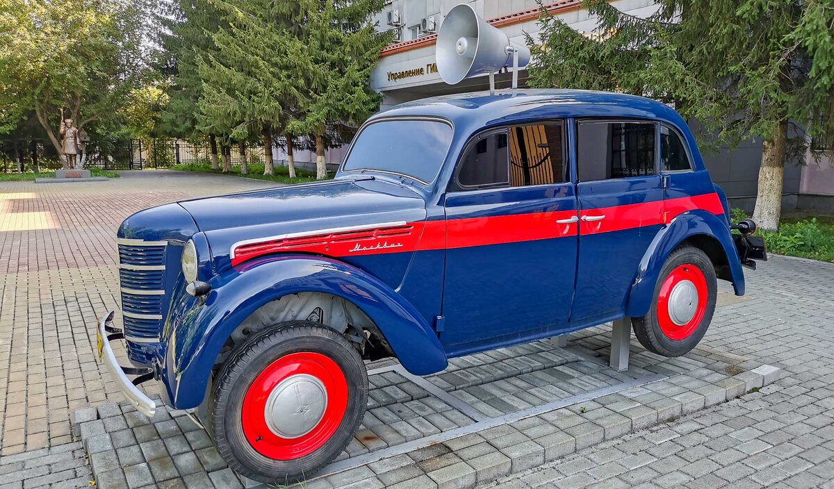 Недавно пришло время обменять водительские права и я отправился в отделение "ОблГАИ" в г. Екатеринбурге. На площади перед зданием установлены несколько памятников, один из них "Москвич-400(401)" в служебной раскраске. В общих чертах памятник передает внешний вид спецмашин того времени, но вот надписи на бортах почему-то отсутствуют. Судя по историческим фото на передней двери была надпись"Милиция", а на задней двери "ОРУД" - отдел регулирования дорожного движения. Красно-синяя раскраска для спецмашин была введена в 1953 году и просуществовала до 1962 года. (листайте фото) Номерные знаки старого образца, насколько они соответствуют автомобилю ОРУД, я судить не возьмусь. На автомобилях того периода свето-сигнального оборудования не устанавливалось, только "колокол" для голосового оповещения, вместо сирены тогда устанавливался электромеханический ревун. (листайте фото) Я подозреваю что это обычный "гражданский" "Москвич" загримированный под спецмашину. Тем более спецавтомобили того врем
