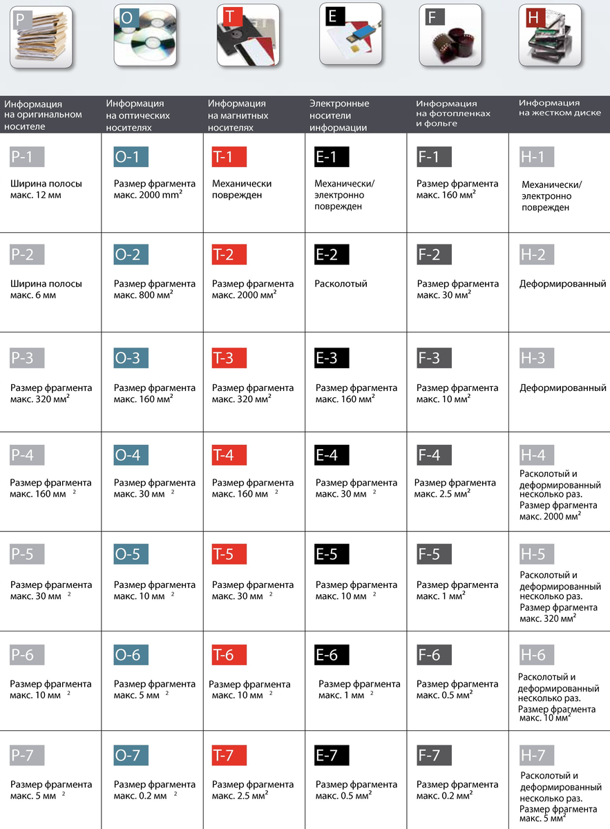 В конце 2012 года Немецким институтом стандартизации ( DIN ) была анонсирована замена DIN 32757, до настоящего времени определявшего уровни секретности при уничтожении документов, на новый DIN 66399-1 , который дополнительно выделяет уничтожение информации на различных типах носителей, в том числе , CD/DVD, дискеты, флэш-карты, карты с чипами и др. Что изменилось? Новый DIN 66399 выделяет 7 уровней секретности при уничтожении данных, в то время как предыдущий DIN 32757 насчитывал 5 уровней секретности и шестой дополнительный, неофициальный. В рамках нового DIN 66399 выделены отдельные уровни секретности для уничтожения информации в зависимости от типа носителя, например, для уничтожения информации на CD/DVD, кредитных картах, дискетах и жестких дисках. Новый стандарт - DIN 66399 Вы можете оценить наглядно размер фрагментов на нашем канале. DIN 66399 - НОВЫЙ СТАНДАРТ УРОВНЕЙ СЕКРЕТНОСТИ В ИНФОГРАФИКЕ Офисный мир. Интернет магазин техники для бизнеса. Офисное, банковское, торговое и обор
