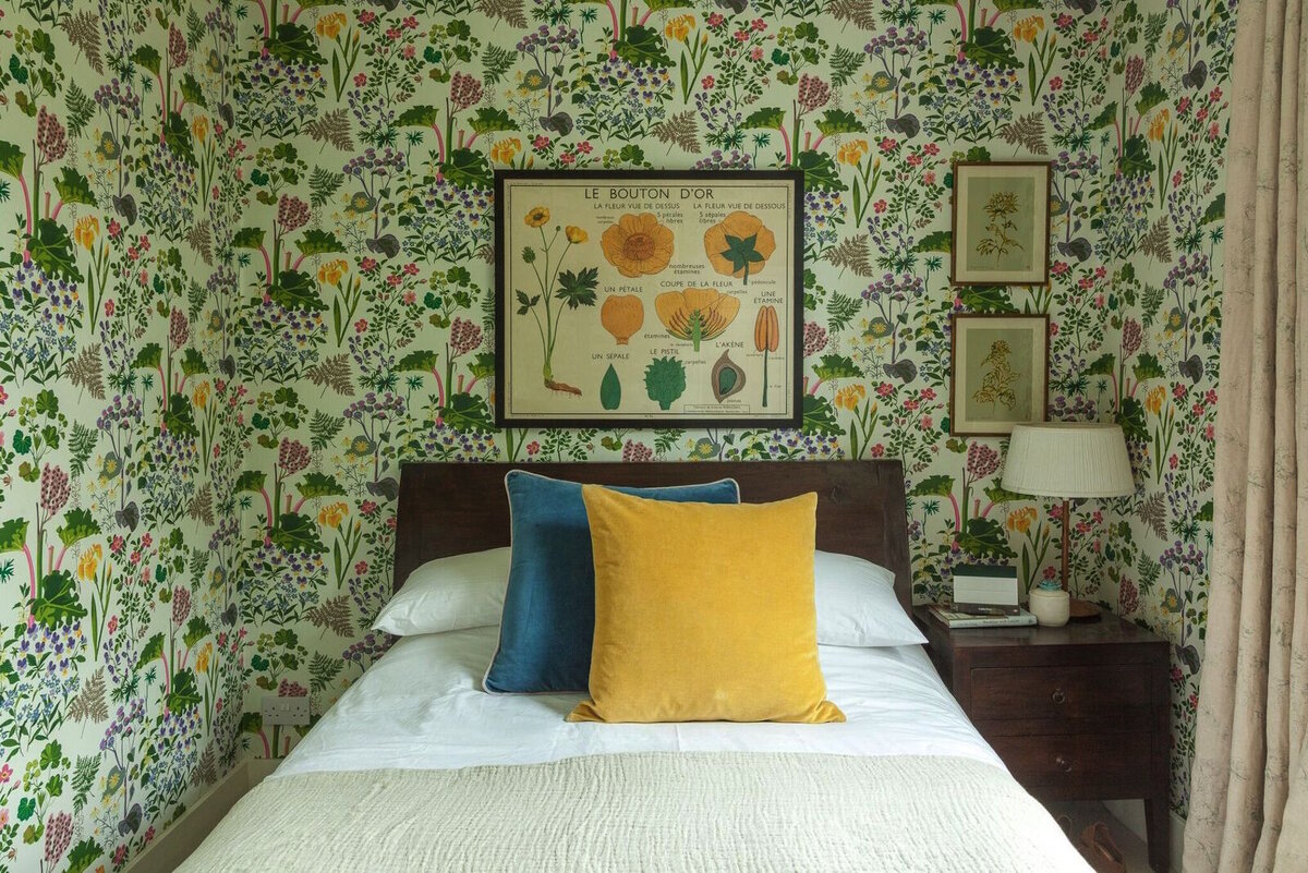 Проживающая в районе Хэмпстед-Хит на северо-западе Лондона, Элли делит дом со своим мужем Саймоном, их двумя маленькими детьми и двумя котятами. Когда они нашли свой дом, они знали, что это то место, которое им нужно. Построенный в 1900-х годах, дом занимает площадь около 180кв.м., расположен на трех этажах, что дает семье Рош, казалось бы, дополнительное пространство, но в то же время сближает их. Несмотря на то, что это дом ее мечты, Элли пришлось отказаться от некоторых своих дизайнерских мечтаний в их доме. “Прекрасная кухня на заказ, которую я спроектировала пока что не по карману, поэтому вместо этого мы купили кухню в ИКЕА. Мы сказали, что накопим и изменим его через год, но на самом деле мы любим то, что у нас есть!". Фотографии Эрла Смита Гостевая спальня в доме Роша, со сложными обоями и винтажным шкафом. “Я люблю смешивать винтаж с современным и часто покупаю вещи, не зная точно, куда они пойдут. Они всегда находят дом, или в доме что-то изменится, и они вдруг обретают с