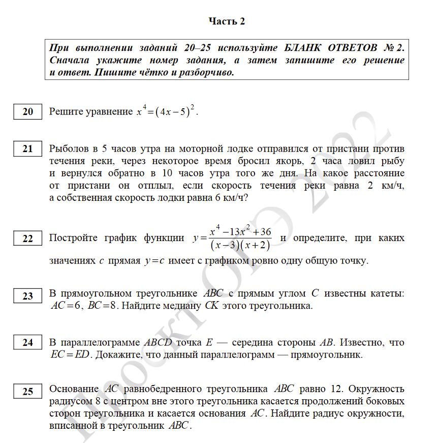 Что будет в первой части и как ее решить написано здесь. Теперь разберемся, чего ожидать во второй части экзамена. Опять же, главный ориентир - демоверсия ОГЭ по математике 2022 от ФИПИ. Вторая часть также состоит из двух условных разделов. Задания 20-22 относятся к разделу "алгебра", а вот задания 23-25 - к разделу "геометрия". Все задания оцениваются в 2 балла. И да, если решить одну геометрическую задачу из второй части, то можно набрать "заветные" 2 балла по геометрии для преодоления минимального "порога". Но сразу подумайте, если вы не можете решить задачи по геометрии первой части (например про треугольники и "геометрию на клеточке"), то шанс правильно решить задачу второй части минимален :( Давайте более подробно посмотрим, что же может встретиться во второй части. Задание 20 В этом задании могут встретиться: Задание 21 Текстовая задача на одну из следующих тем: Как решать задачи можно посмотреть в двух уроках: урок1 и урок2 Задание 22 Построение графика функции и его исследо