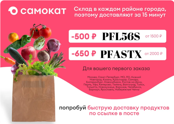 Всем привет. Это моя первая статья на канале. И я бы хотел для начала объяснить, что же я буду вещать. Думаю, по названию канала понятно, что тут будут для Вас найдены практически все интересные предложения. Начиная от скидок на видео игры и заканчивая акциями в Макдоналдс и аптеках. Подписывайтесь на мой канал и Вы точно узнаете самыми первыми обо всех скидках и тайных акциях. А в конце Вас ждет еще одна очень важная информация. Настоятельно рекомендую Вам до нее дочитать) 1. А начну я с промокодов на такой популярный сервис доставки еды "Самокат". ПРОМОКОДЫдля доставки "Самокат(КЛИКАЙ СЮДА)" ПРОМОКОДЫ: PERRCI - СКИДКА 200 на первый заказ для регионов! PF2M8UO - СКИДКА 200 на первый заказ для Москвы и МО! PFASTX - СКИДКА 650 на первый заказ от 2000! PFBUKJ- СКИДКА 300 на первый заказ от 700! PFL56S - СКИДКА 500 на первый заказ от 1500! Доставка продуктов за 15-30 минут! 1. Качаем приложение для IOS и Android 2. Собираем вкусности! 3. Применяем промокод4. Получаем доставку и нас