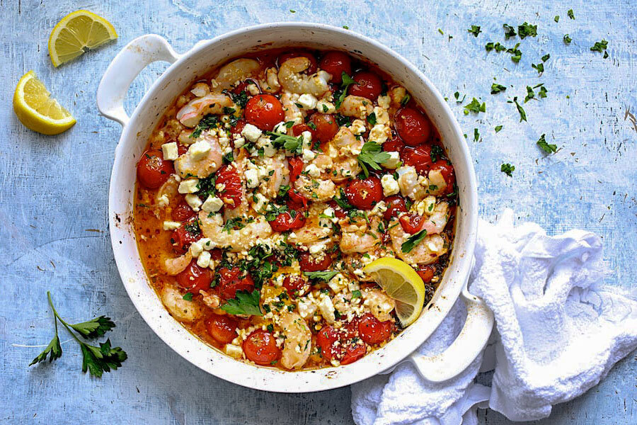 Как хочется в Средиземноморье, куда-нибудь в Грецию, где солнце, море, песочек и вкусности! Если вы не планируете поездку туда, где загар, большая вода и пляжи, но очень хотите почувствовать эту атмосферу, приготовьте на ужин средиземноморское блюдо. А что, как не морепродукты с брынзой и овощами передадут вкусы жизни около моря? В Греции такое блюдо называется “креветки саганаки” или “креветки санторини”. Оно сочетает в себе креветки с помидорами и сыром фета и абсолютно восхитительно во всех отношениях. Подавайте его со свежим хрустящим итальянским хлебом, для окунания в соус, и наслаждайтесь необычайным вкусом. Ингредиенты Блюдо готовится быстро, просто, получается гарантированно вкусно. Креветки можно взять любого размера. Помидоры также выбирайте на свой вкус, я люблю с черри, так как, нарезанные пополам, они сохраняют аккуратную форму в готовом блюде. Вино можно добавлять, а можно не добавлять. Если вы волнуетесь, что дети не смогут есть блюдо, при приготовлении которого использо