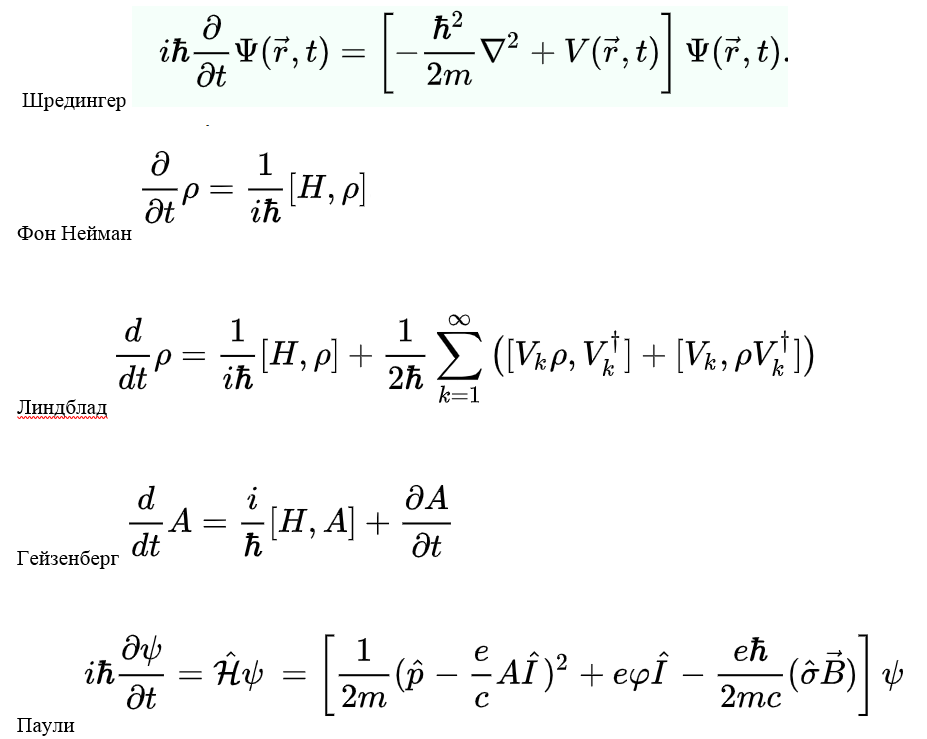 Других описаний чего-либо я пока не нашел. Да думаю их по логике и быть то не должно. Действительно, если атом водорода Фейнман верно описал при помощи уравнения Шредингера, то с необходимостью такие же результаты должны будут получится у любого ученого, описывающего атом водорода пользующихся фомулами Неймана, Линдбада и другими.