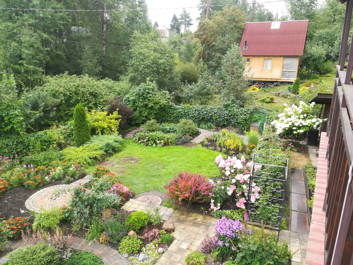 Пришел к нам приятель на днях и говорит, что надо сад сфотографировать с дрона. Дрона у нас нет, не то что с камерой, никакого нет. И решила я попробовать в очередной раз пофотографировать с балкона и из окна второго этажа. Высота там, скажу я вам, приличная, далеко видно. Итак на верхней фотографии лужайка, пострадавшая от тротуарной плитки, пролежавшей там несколько недель. Надеюсь, к концу сезона трава отрастет. Пойдем по кругу вправо, начиная с барбариса Тунберга. Замечательный бордовый/вишневый/алый барбарис. В разное время оттенки меняются. С первыми морозами будет просто алым костром гореть. Дальше гортензия Ванилла и розовая стеночка. Потом разоренный весенний цветник. Оставила там лилии, посадила еще одну гортензию, с весны лиатрис колосковая белая пока остается. Из весенних остался пион и гиацинтоидес. Они уже сбросили листья давно. Петунии использованы как временный вариант. На втором плане за дорожкой то, что я называю "огород". Там клубника, земляника, зелень, огруцы и ..