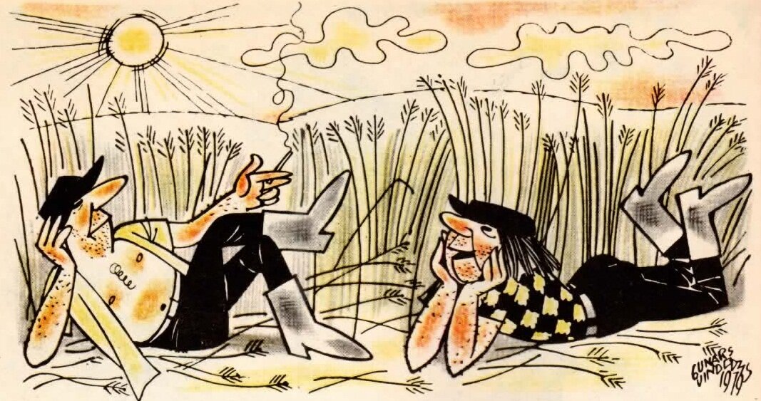 В статье использованы работы мастера советской карикатуры Гунарса Виндедзиса. Сканы автора из источника принадлежащего автору. Перепечатка возможно только с разрешения.