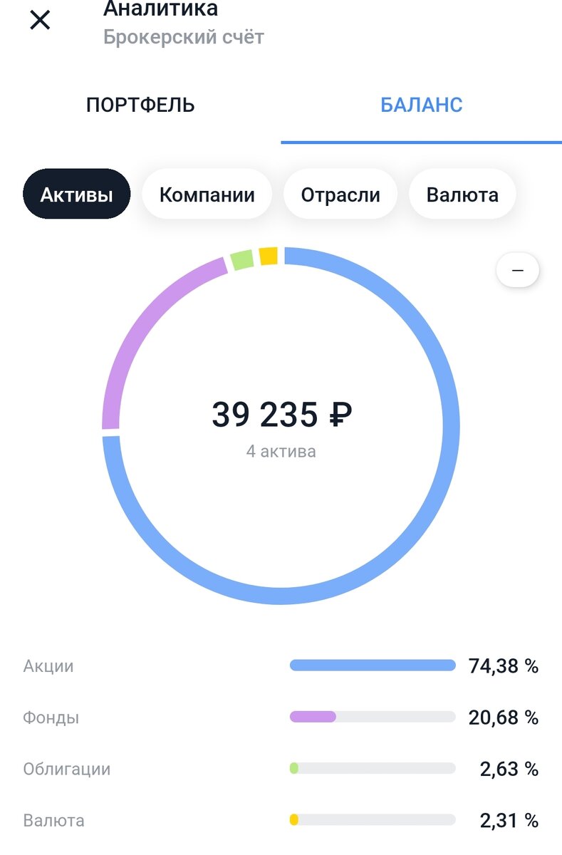 Добрый день! Начинающим инвесторам не очень то легко разобраться сразу с тем, какие акции покупать, стоит ли приобрести ту или иную акцию сейчас или подождать? Именно для этого на рынке существуют фонды. Фондами управляют эксперты. Они анализируют рынок и принимают за вас решение, какую акцию лучше купить. Когда вы вкладываете деньги в фонды, вы можете одновременно купить и акции "Газпрома", и "Сбербанка", и "Магнита", и других компаний. Можно выбирать отраслевые фонды: IT-сектор, Золото, Медицина и др. Можно выкладывать в фонды акций или облигаций определенных стран, можно взять фонд акций глобального рынка. Сегодня я расскажу, какие фонды я брал на первом этапе. Сейчас мой портфель выглядит вот так: Фонды составляют 20% в моем портфеле. Покупка фондов показалась мне интересной идеей, ведь я могу одновременно стать совладельцем сотен компаний в разных уголках мира. Фонды не дают такой большой прибыли, как акции, но являются более надёжными и дешёвыми. Я стараюсь держать свои фонды