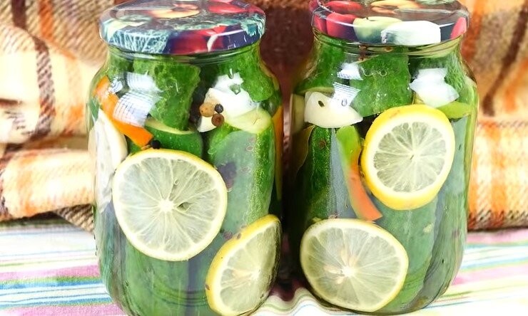 Ингредиенты На 2 банки по 1 л: Огурцы (количество зависит от размера огурцов) Горчица в зёрнах — 1 ч. ложка Лимон — 2 кружка Перец чёрный горошком — 6 шт. Чеснок — 4 зубка Укроп (зонтики)