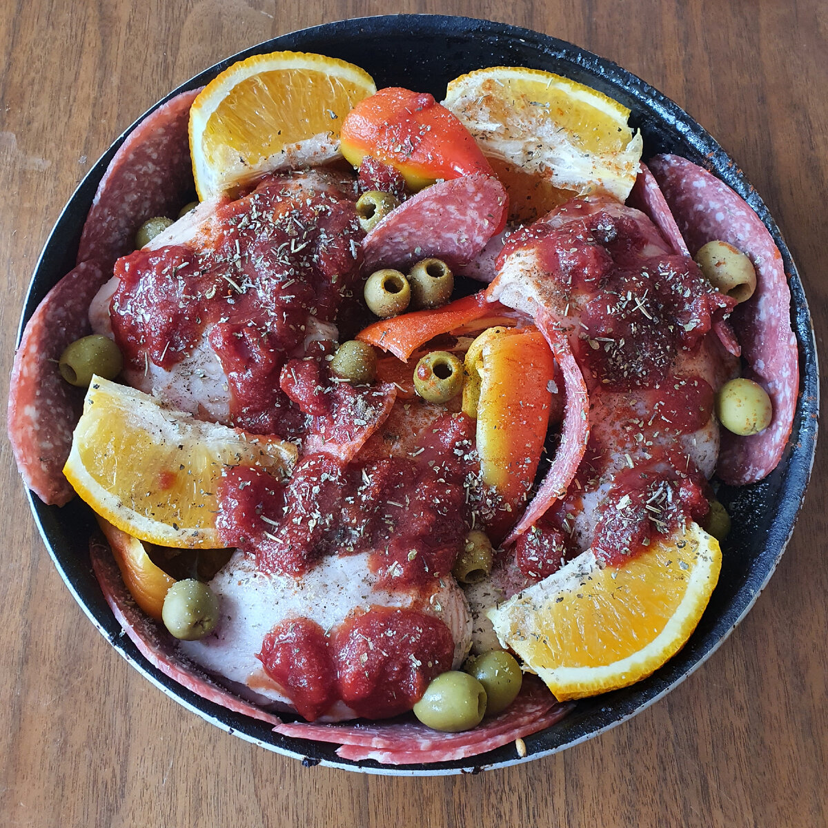 Продолжение дня. Пока шла по территории Лужников из бассейна, почему-то думала про оливки. Захотелось, аш жуть. Дома меня ждали три размораживающихся окорочка. Сильно проголодавшись после ленивого спорта, я решилась - буду делать курицу на итальянский манер. На итальянский манер в сковородку для запекания полетело: куриные окорочка, оливки, очень острая салями, апельсин, болгарский перец, итальянские травы и мой фаворит недели томатный соус. Я часто покупаю томатную пасту. В этот раз ее на полке магазина не оказалось. Рядом стояли стеклянные бутылочки томатного соуса. И я купила его на замену. Вдруг понадобится использовать в каком-то блюде. Когда я принесла его домой и открыла, он очень вкусно пах, такой пряной кислинкой что ли. Как-то я добавила его в запеченной картошке сперва чуть-чуть. Потом распробовала окончательно и понеслось. Я так и не поняла как обычная вещь как томатный соус может быть столь вкусен, что под ним можно сьесть жабу и не заметить. Он отлично улетает у меня с
