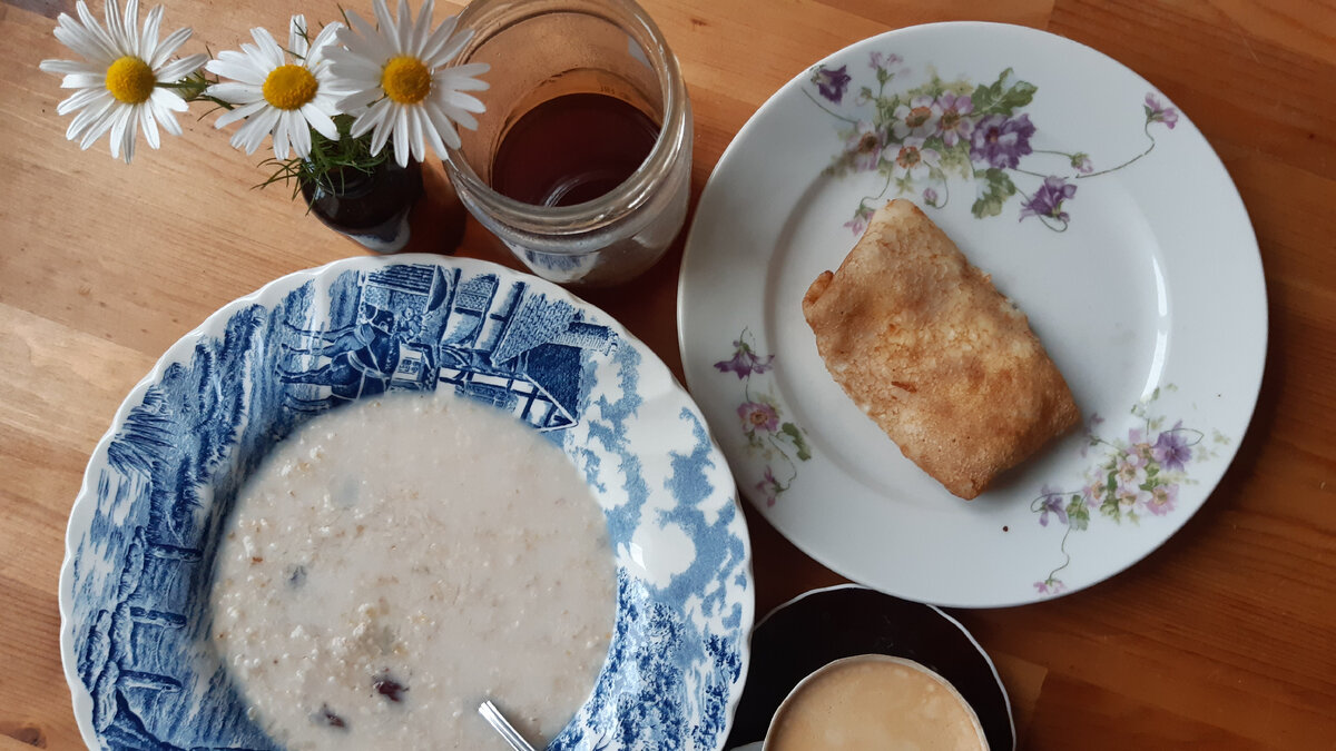 Всем добрый день, дорогие читатели! В этом месяце мы питаемся на сумму меньше, чем прожиточный минимум. На питание у нас определена сумма 50% от ПМ, как предусмотрено правительством. Но мы сделали крупную годовую закупку кофе - 10 кг, по выгодной цене, так что из суммы ПМ на питание еще минус 5,5 тыс. К завтраку сегодня у нас овсяная каша с изюмом и медом, добавила еще немного рисового молока. И к кофе - блинчики с творогом, я их заранее делала и замораживала. Для завтрака просто разогрела на сковороде под крышкой на медленном огне (лучше достать вечером и разморозить, но я забыла). Такие же блинчики брала с собой на обед на работу, а сын взял с собой замороженую домашнюю пиццу - очень выручают такие заготовки уже приготовленной домашней еды. На ужин собрала все, что было в холодильнике - а было много вареной картошки, немного копченой скумбрии, остатки овсяной каши от завтрака. Картошку обжарила с луком и грибами, ели со скумбрией, добавила к этому еще помидорчик. Из овсяной каши п