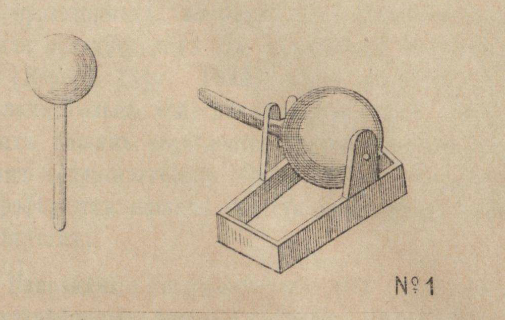 Около 1630 года, магдебургский бургомистр О. Герике, известный в свое время изобретатель по некоторым отделам физики, стал повторять опыт Джильберта. Вскоре он нашел необходимым прибегнуть к более сильным действиям электричества; поэтому устроил первую электрическую машину, хотя по сравнению с теперешним понятием о частях и принадлежностях электрических машин, трудно ее назвать машиной. Она состояла из сернаго шара, величиною с детскую головку, насаженнаго на железный стержень, заменяющий рукоятку. Этот шар вставлялся в стойки особеннаго деревяннаго штатива и мог обращаться в них около своей оси (фиг. 1).