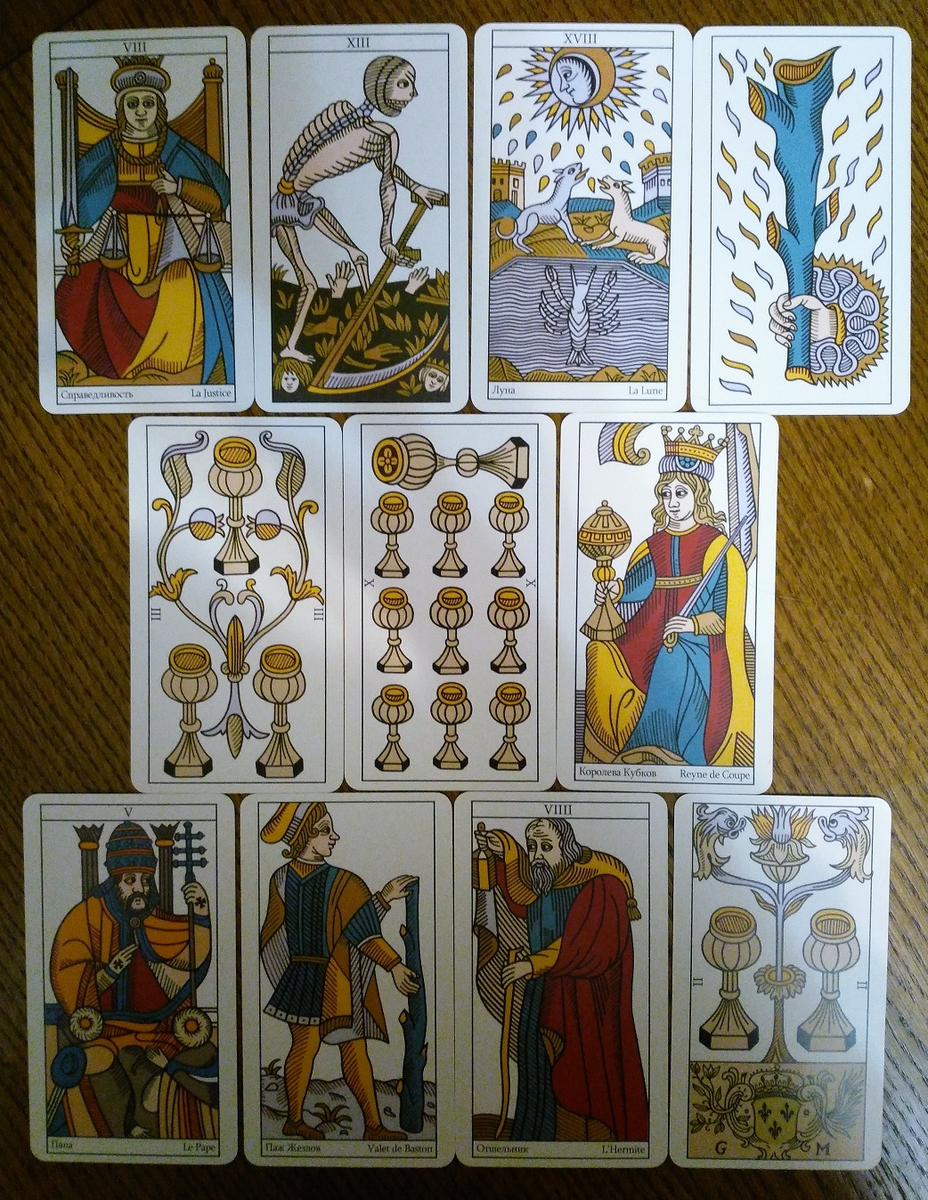 У Скорпионов, как известно, специфическое отношение к трудностям. Они их только закаляют и будоражат, вызывают живой интерес. Именно поэтому будем условно считать, что для этого знака зодиака отрицательные прогнозы крайне редки. Итак, посмотрим, что у нас получилось применительно к осени. Верхний ряд – общие тенденции. Справедливость. Наш Скорпион получит именно то, чего достоин. Смерть. Будут перемены и глубинные трансформации, выздоровления и обновления, кардинальная смена парадигмы и ситуации. Для Скорпиона с его могуче-разрушительной марсианско-птутонианской энергетикой всё это является абсолютной нормой жизни. Он привык раз в какой-то период сбрасывать кожу и начинать всё как бы с чистого листа (учитывая весь предыдущий ценнейший опыт, конечно, ведь Скорпионы отличаются проницательностью и наблюдательностью). Луна. Иллюзии, столь не свойственные Скорпиону обычно, тут, как ни странно, появятся. Видимо, после очередной трансформации возникнут новые планы и мечты или же оживут стары