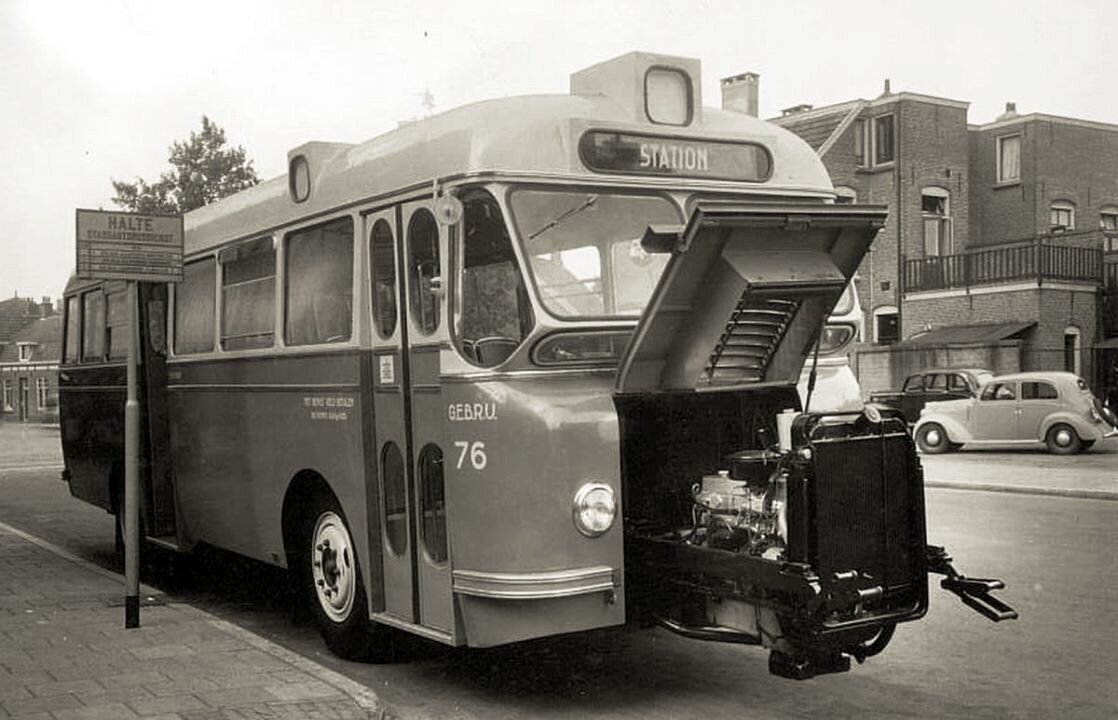 Глядя на этот автобус, вспоминается известная фраза из мультика про Винни Пуха. Входит, и замечательно выходит. Только в данном случае речь идет не про шнурок от шарика, а про двигатель автобуса DAF Domburg Diesel первого поколения. Идея была простой как все гениальное – для обслуживания или ремонта мотора водитель мог просто вытянуть его наружу вместе с подрамником, разблокировав фиксаторы двумя массивными ручками. Причем сделать это он мог в любом месте, хоть на остановке. С трансмиссией двигатель соединялся посредством специальной муфты, которая оказалась слабым звеном всей конструкции. Быстро расшатывалась и выходила из строя. Поэтому в серийное производство задумка не пошла, сделав несколько экспериментальных образцов от этой идеи отказались. Кстати, на нашем ЗИЛ 158 тоже было нечто подобное. Там тоже мотор стоял на подрамнике и его можно было выдвинуть вперед, только для этого приходилось открутить болты крепления подрамника, кардана от фланца КПП, снять привод сцепления, отсоеди