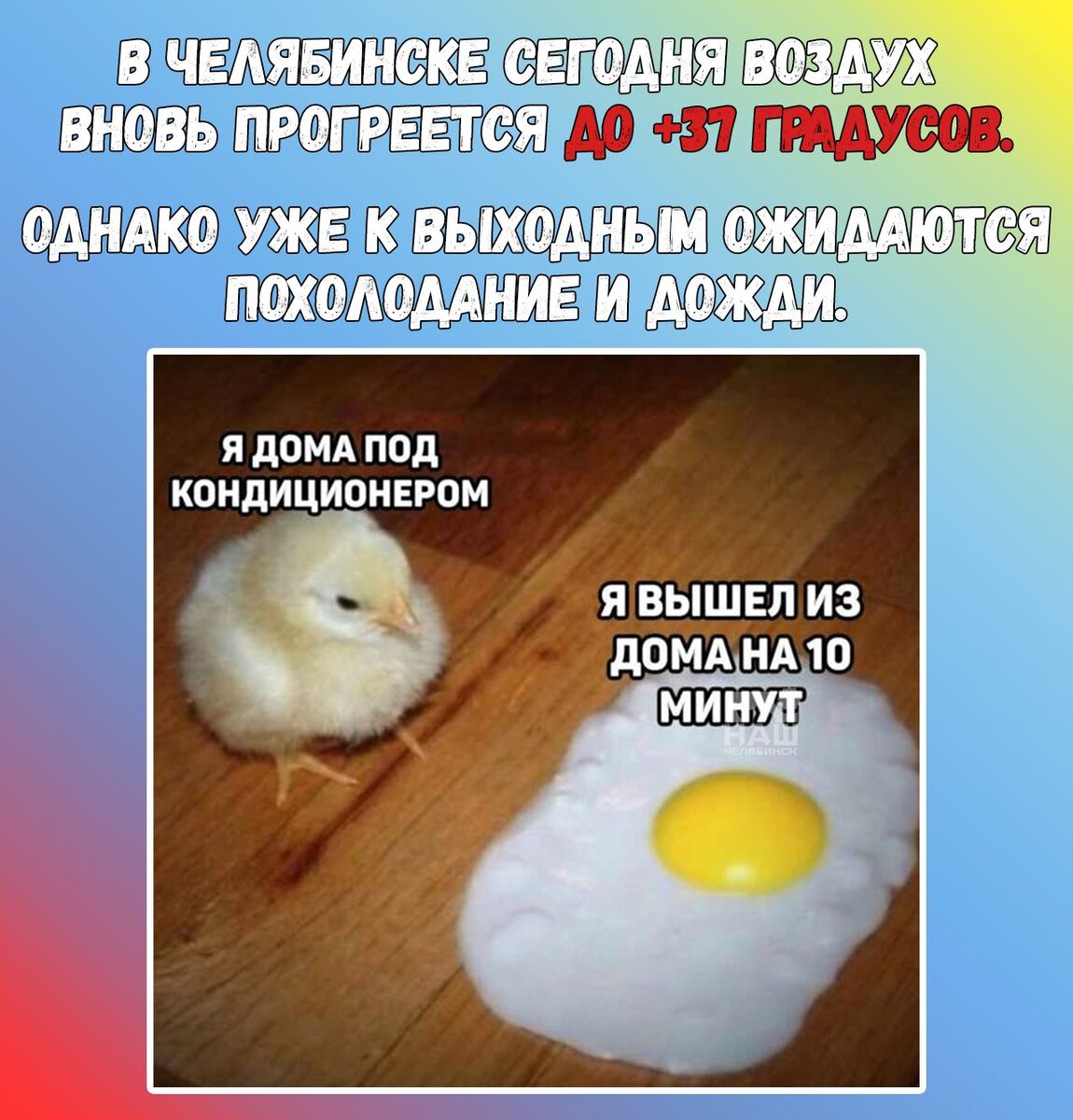 🔥 Аномальная жара в Челябинске продержится ещё несколько дней. Сегодня температура воздуха вновь прогреется до +37. МЧС продлило экстренное предупреждение. Там напоминают, что в такую погоду нужно пить больше воды, принимать холодный душ и постараться не выходить из дома в часы активного солнца. Холодать начнёт уже с пятницы, по прогнозам синоптиков синоптиков, в последний будний день воздух нагреется до +32 градусов. А в субботу столбики термометров опустятся до +20, также обещают дожди.