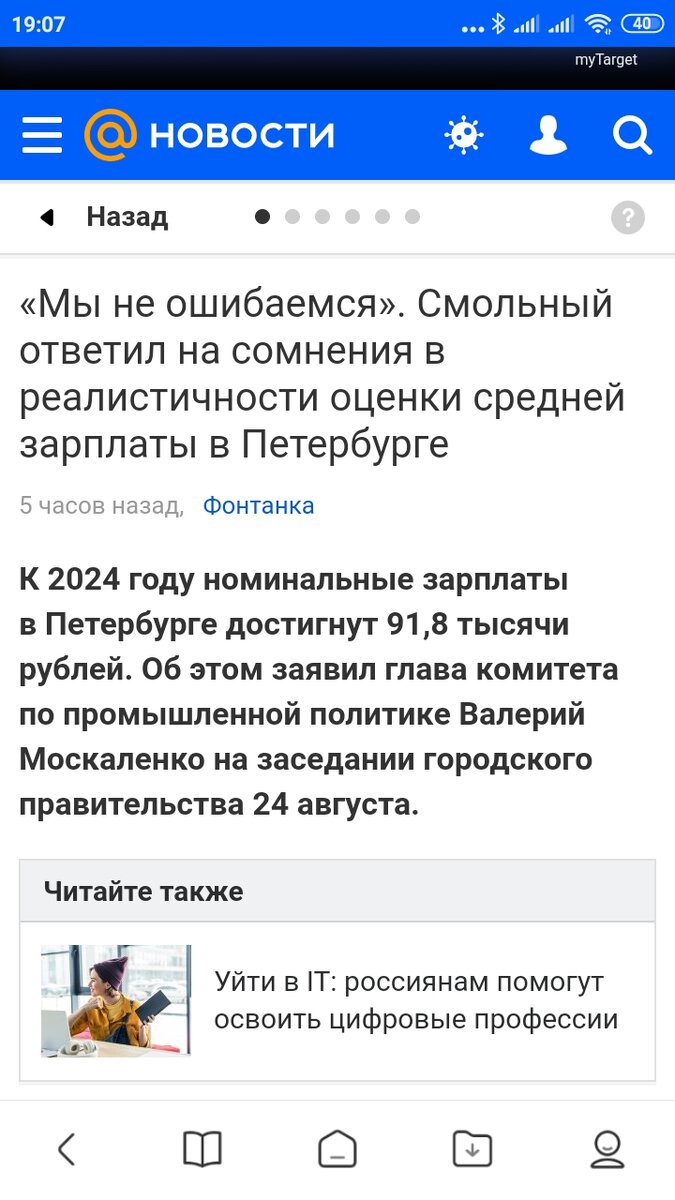 Вчера ощутила себя немного ущербной. Читала майл и глаза зацепились за фразу, что в 2024 году жители Санкт-Петербурга в среднем будут получать 91.8 тысячи рублей. Даже сделала скрин, чтобы меня не посчитали голословной или выдумщицей. Но ладно фраза о будущем. Гораздо больше задело, то что сейчас оказывается средняя зарплата составляет 73тысячи. Мне стало очень грустно. Я задумалась о своем окружении. Оно у меня в основном оказывается даже не среднее, а просто низший класс (включая и меня саму). Сейчас я в декрете (из которого скоро выйду), до него, пару лет назад мне платили на руки 28 тысяч рублей при пятидневке. Но это было пару лет назад. Возьмем время сейчас... Одна подруга на почте получает около 20 тысяч рублей. Другая подруга около 30 тысяч (если без подработки). Третья подруга сейчас ищет работу, рассматривает вакансии на 50 тысяч и очень долгое время не может ничего найти. Потому что на такую маленькую (судя по средней зарплате в 74 тысячи) претендует огромное количество л