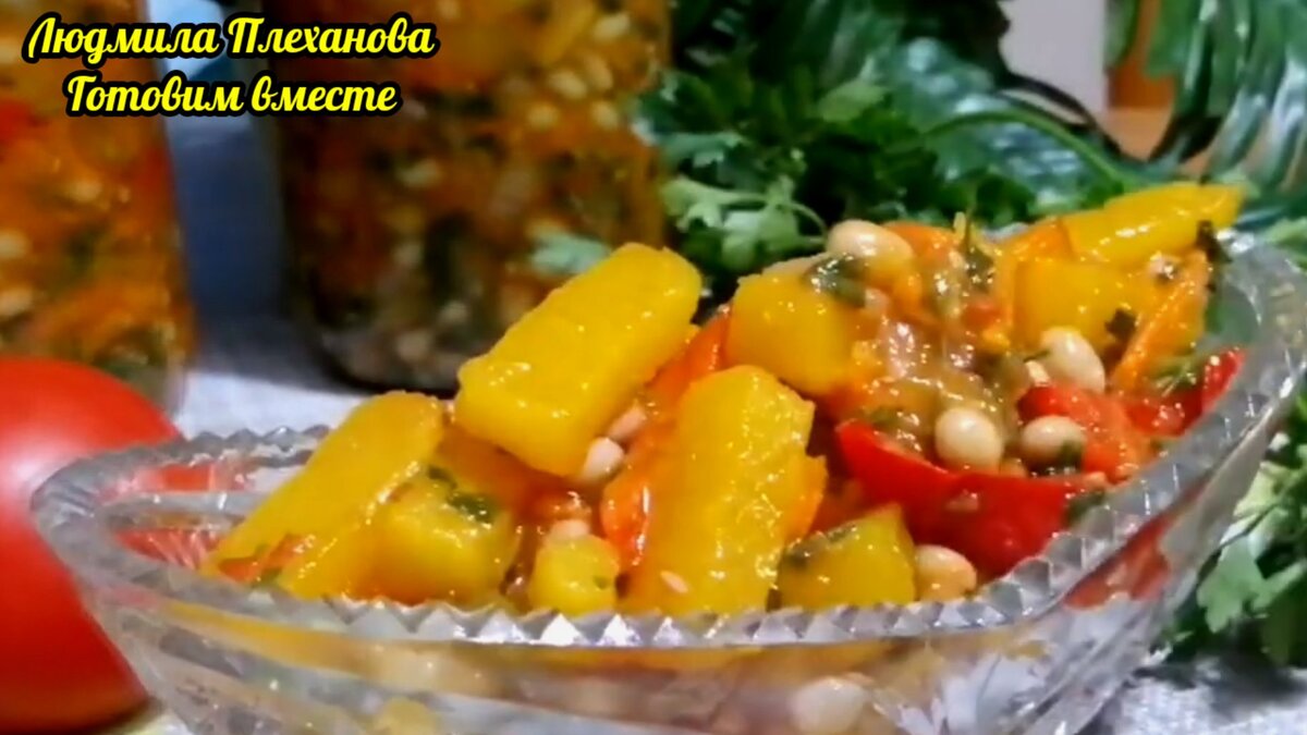 Нежная, пропитанная маринадом и ароматом чеснока тыква гармонично сочетается со вкусом белой фасоли и остальных овощей, которые есть в этом салате. Моя семья до недавнего времени (пока я не стала вести кулинарный канал и активно экспериментировать на кухне) предпочитала тыкву только в сладком виде. А теперь несладкие рецепты с тыквой (оладьи, пироги, с жареным картофельем, салаты, закуски, в соусе....) у на идут лучше, чем сладкие блюда. А если учесть, что этот салат - закуска на зиму делается просто и быстро, то я уверена, что рецепт вам понравится. Сразу приготовим овощи : Тыкву режем брусочками 4 см длиной, перец режем соломкой, лук режем полукольцами, морковь трём на корейской тёрке, помидоры пробиваем блендером, зелень мелко режем. ЛИСТАЕМ ГАЛЕРЕЮ: Обжариваем лук и морковь до золотистого цвета на растительном масле. Добавляем томат и доводим до кипения. Провариваем 5 - 7 минут. Высыпаем соль, сахар, выливаем уксус, выкладываем тыкву, болгарский перец, фасоль вместе с сок